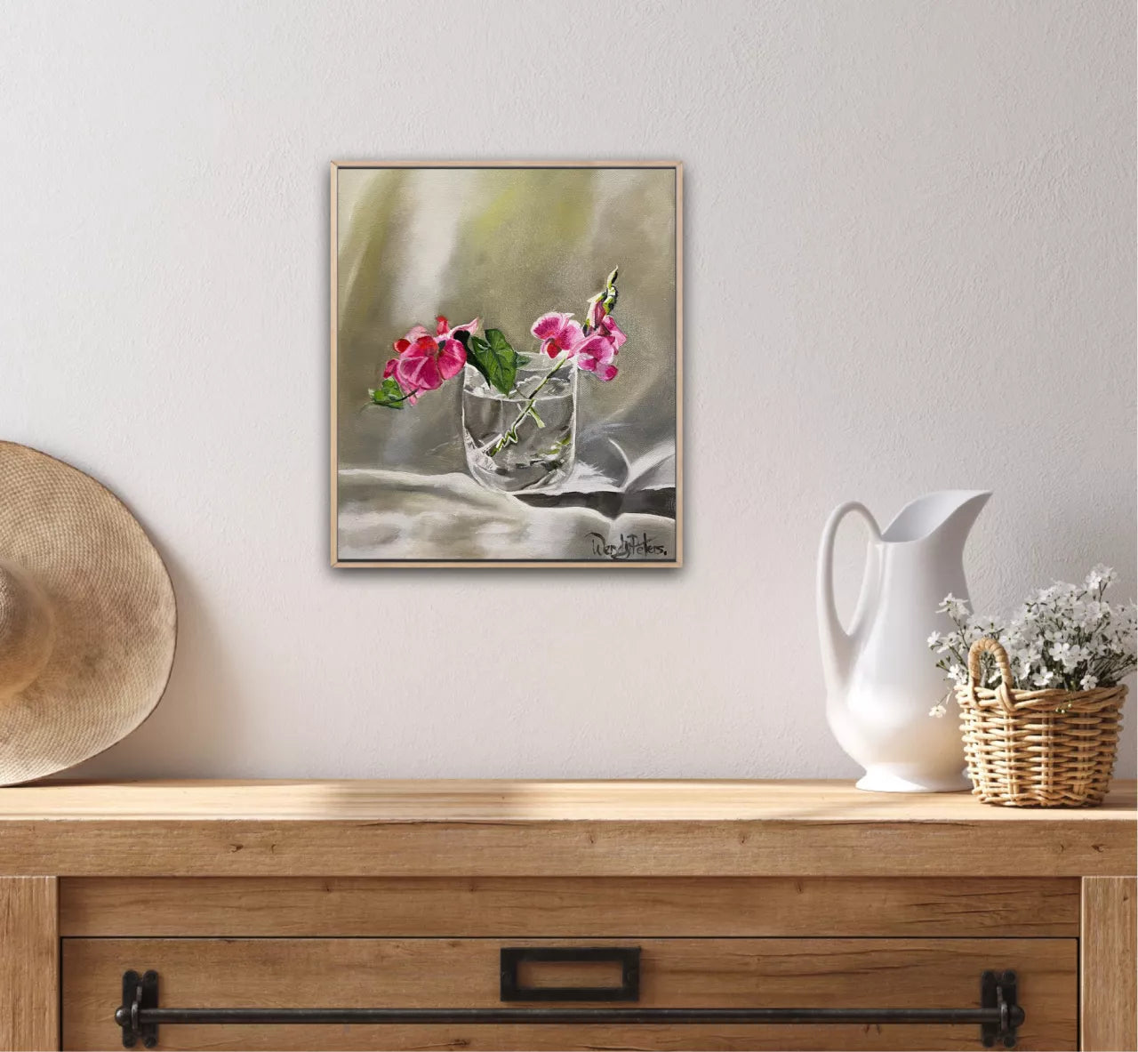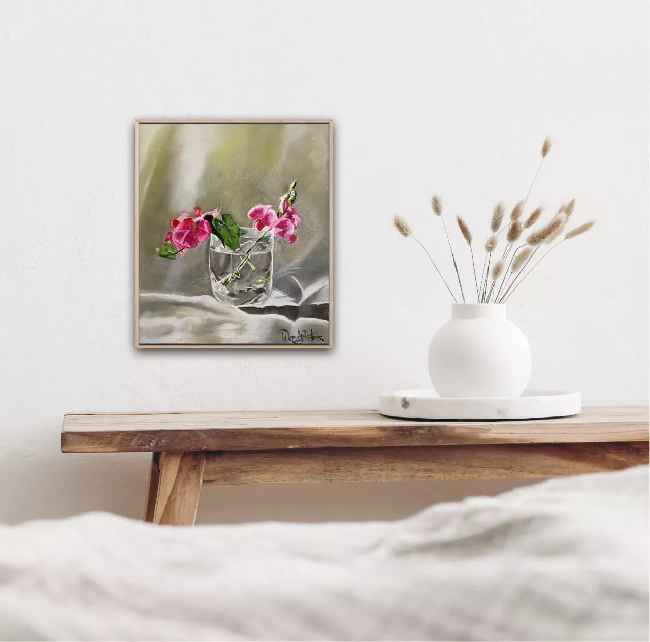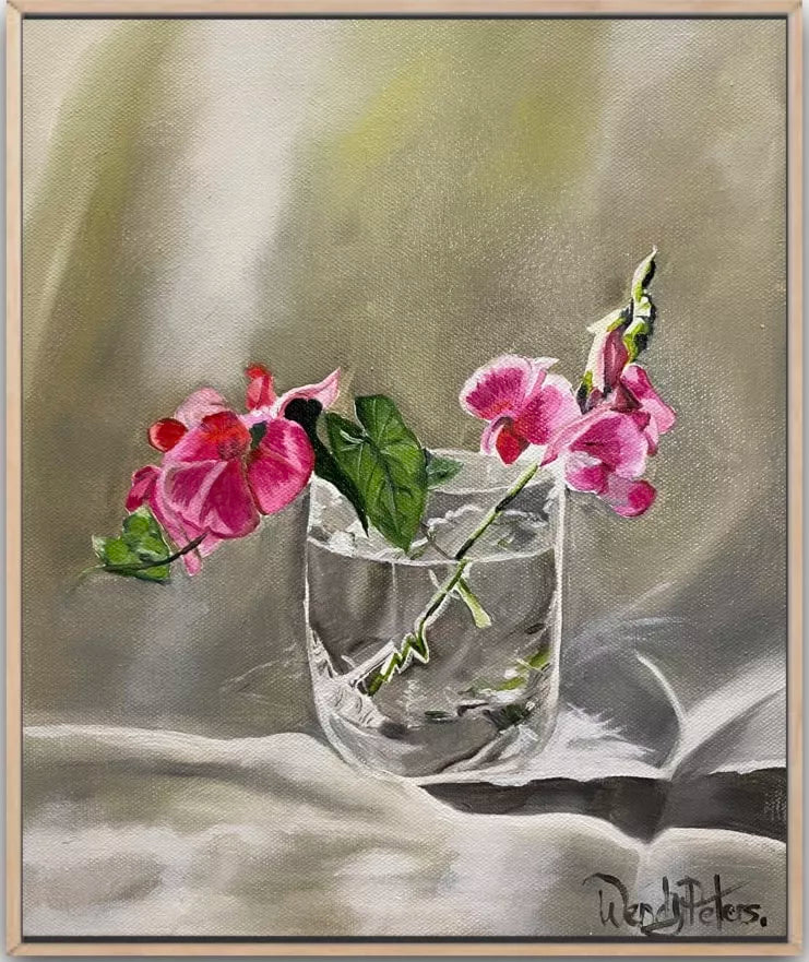 Pink sweet-peas in a simple glass encapsulate the beauty and fragility of nature. It evokes a sense of tranquility and serves as a gentle reminder of the fleeting but enchanting moments that exist within our surroundings. Framed in a Tasmanian oak float frame.