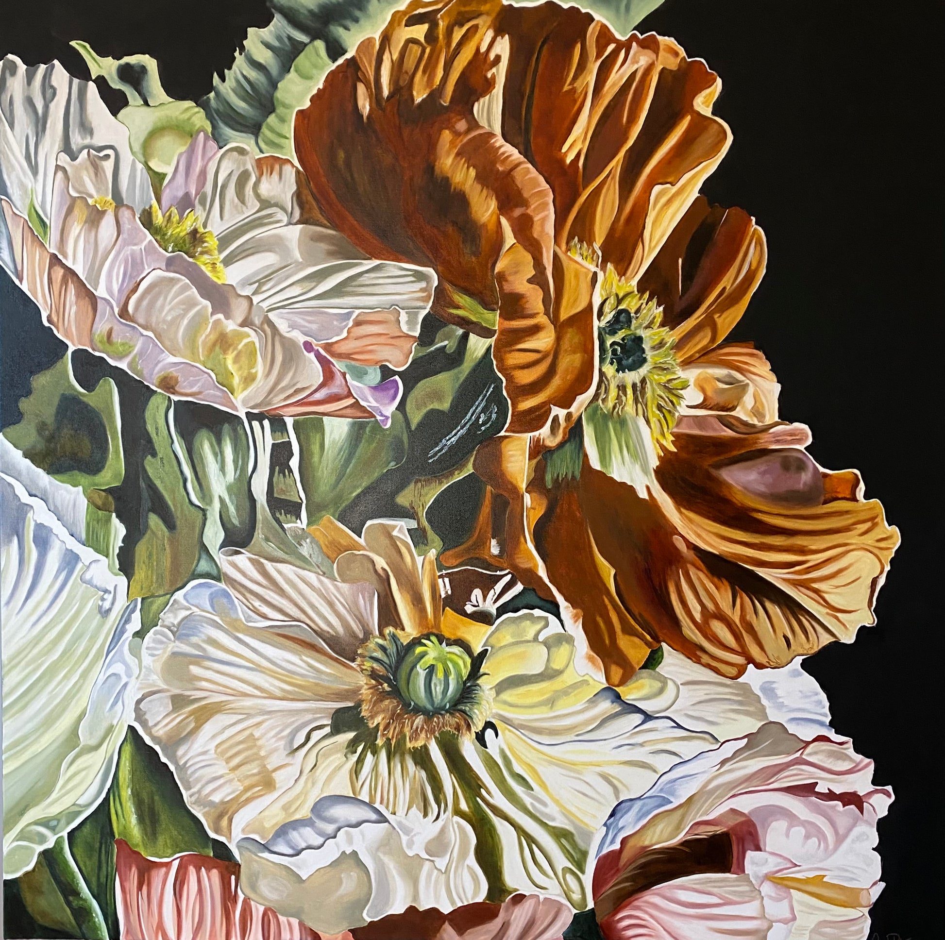 Perfect Pleats that is what poppies always remind me of, and that beautiful fabric originally brought to the world in 1988 by the famous fashion designer Issey Miyake (and much copied since). When living in the UK I used to window shop his store in Conduit Street, London and lust after the designs which were way out of my price bracket, I was intrigued by the architectural affect in the designs. So in this case my love of botanicals and fashion are a combined inspiration for this painting. The light source bouncing off the flowers highlights the fragility of the petals. Working in close focus gives the painting a contemporary look that would work well in a modern or classic setting.