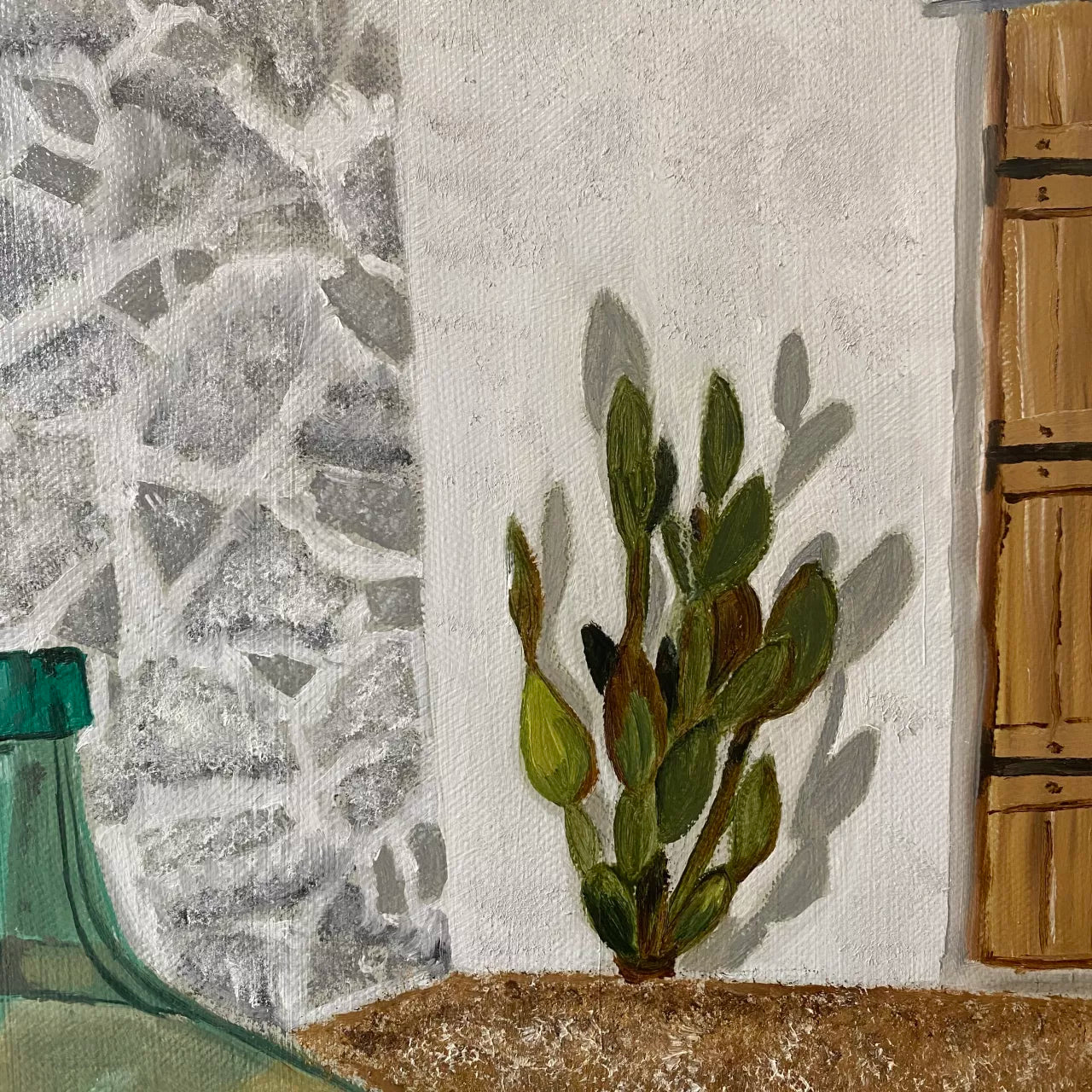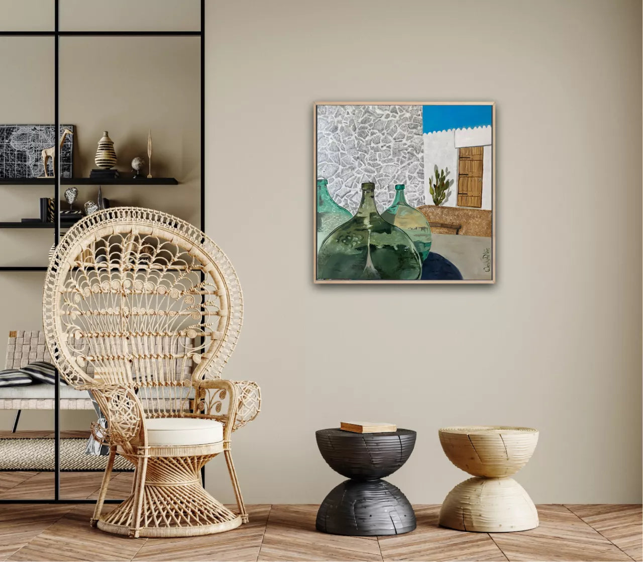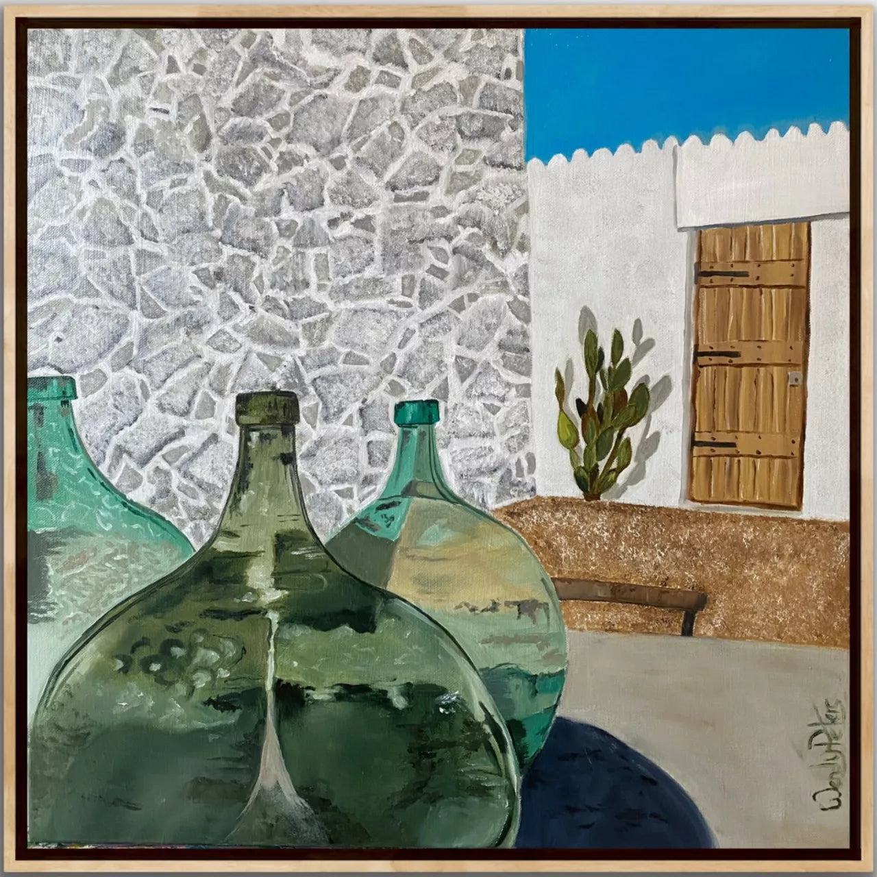 Memories of fragrant mornings and joyous evenings, the charming simplicity of village life revealed through ancients walls, olive jars, the play of light and shadow, time seems to stand still and the weight of the world is forgotten. Framed in oak float frame.Supplied with a Certificate of Authenticity