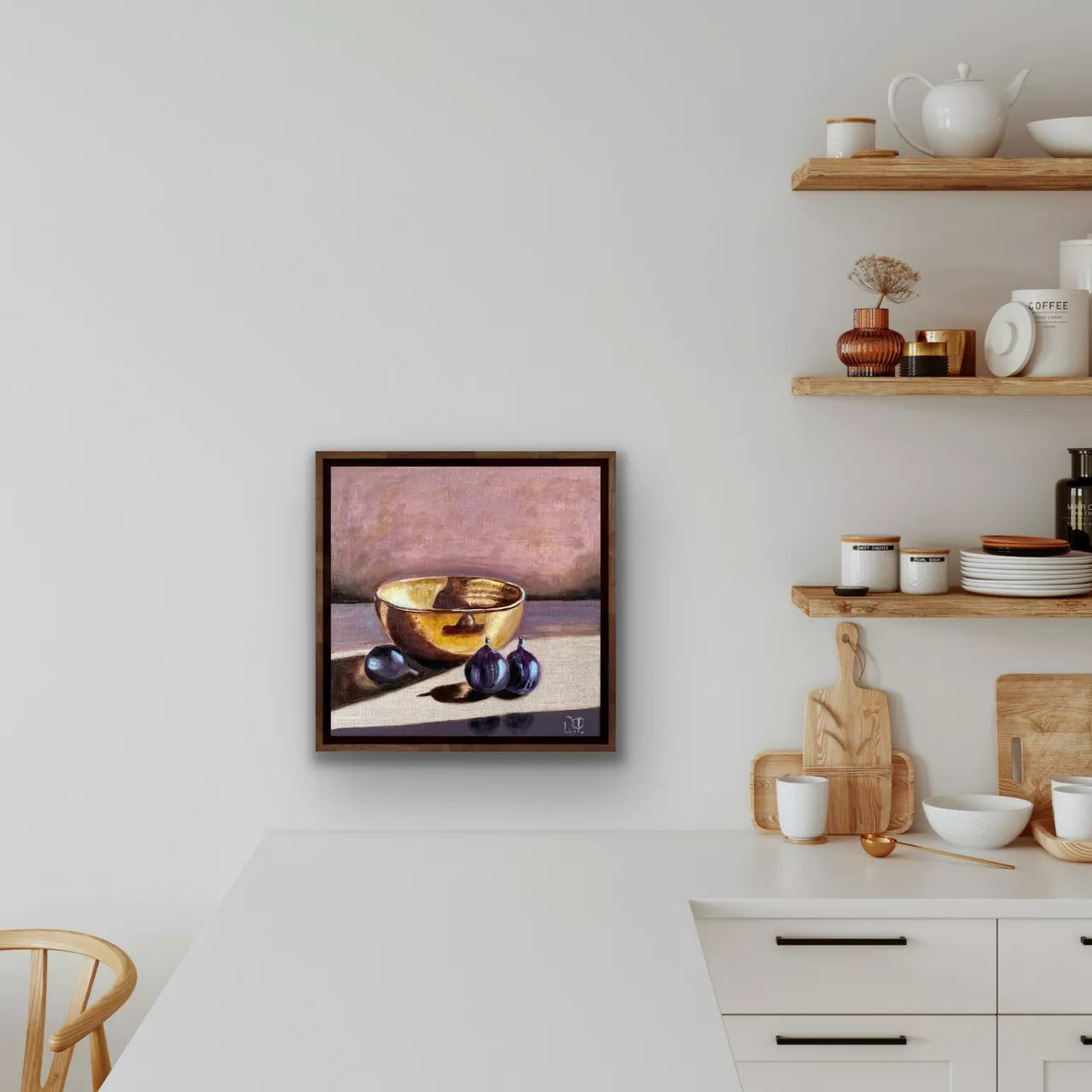 In this small painting, I wanted to capture the quiet beauty I find in everyday objects. the warm, inviting glow of the brass bowl, its smooth surface reflecting the light in soft, almost liquid shimmers. I love how the metal seems to hold a history, a sense of timelessness.The figs, their deep, rich purple against the golden bowl felt like a perfect harmony, a contrast that speaks to the simple abundance of nature. There's a quiet stillness in this scene, a moment of pause where the ordinary becomes extraordinary.Framed in Dark Brown High Quality Float Frame. (Size includes Frame)Supplied with a Certificate of Authenticity.