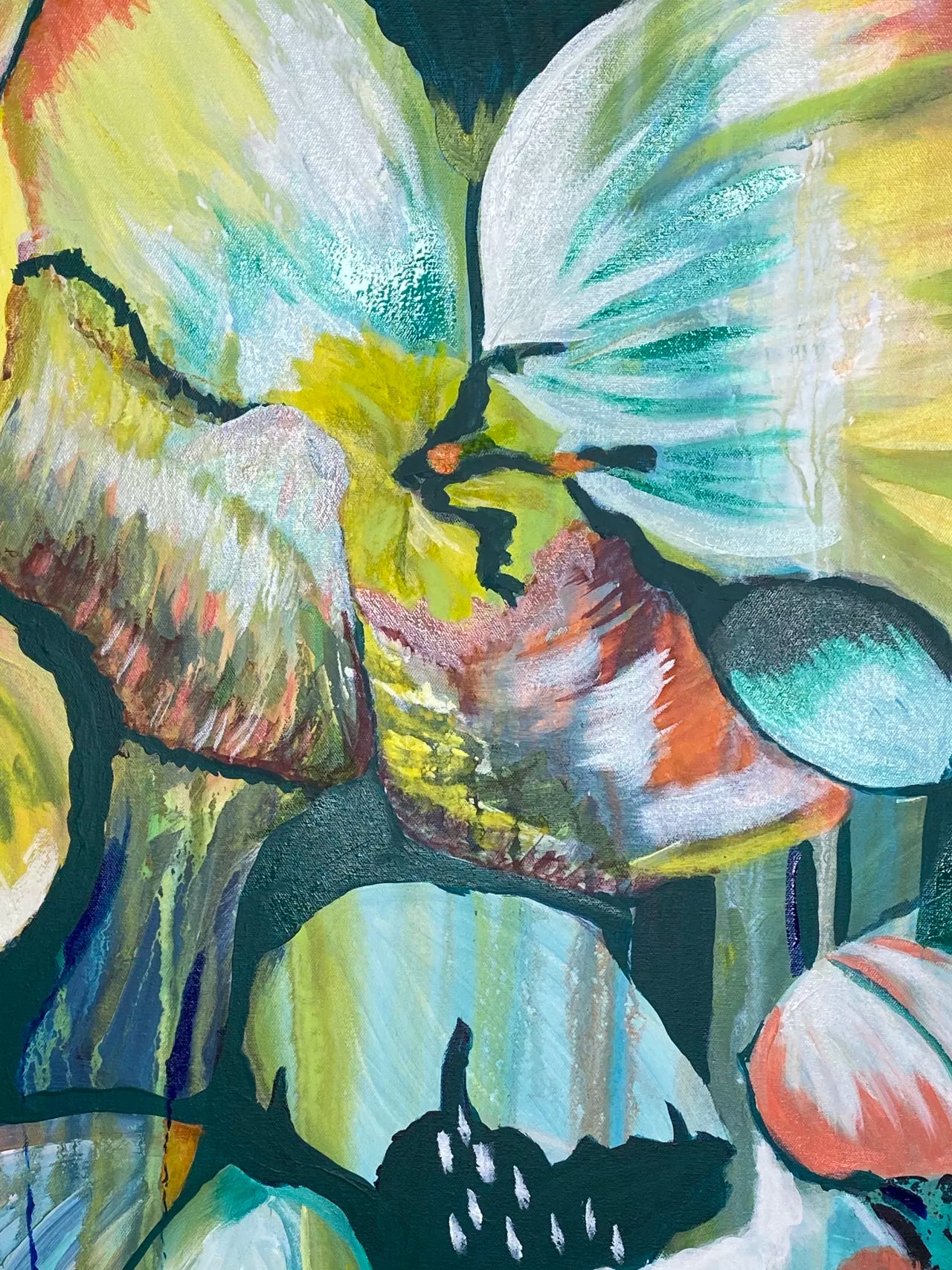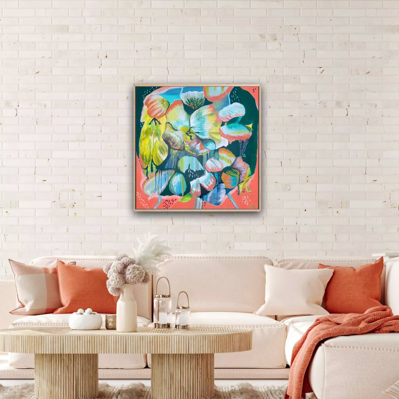 Reminiscent of snorkelling in the Great Barrier Reef. All those incredible vibrant colours. Would so love to visit again, was a truly beautiful experience, maybe next year. Mixed Media on canvas. Signed on the front. Framed In a natural Tasmanian oak float frame with wire across the back.