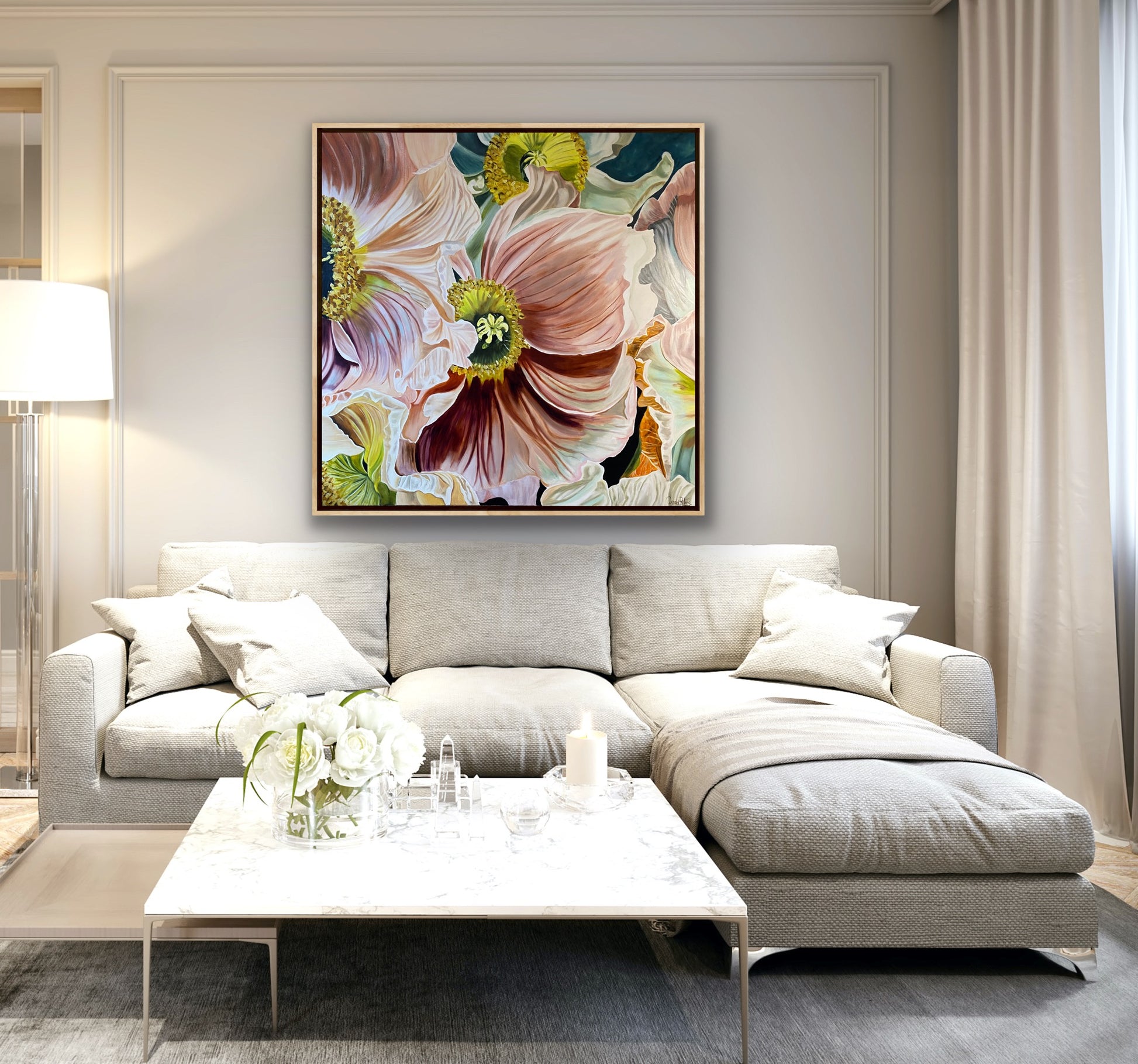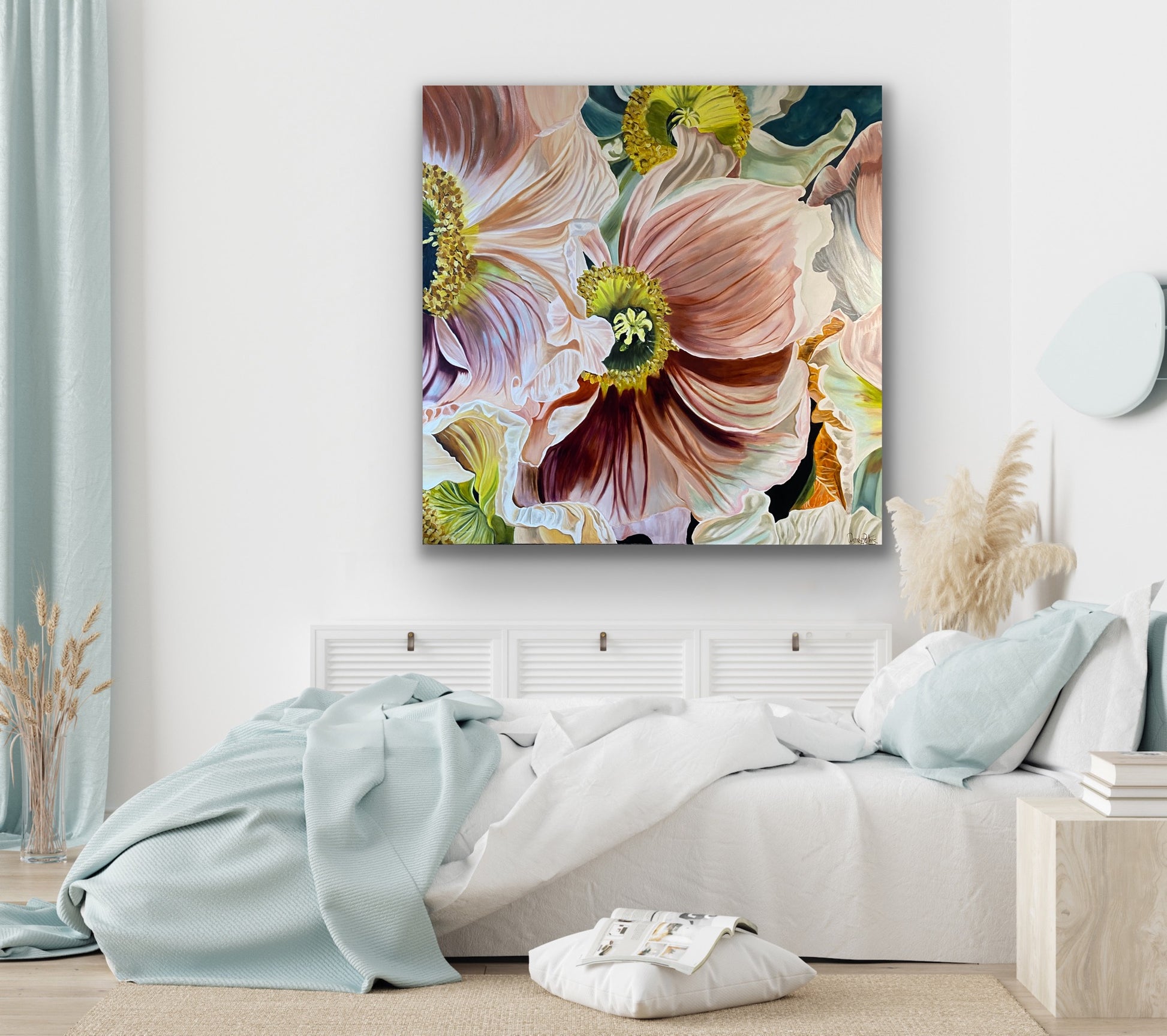 This artwork features several poppies in rich tones of pink, sienna, and lilac. I focused on a detailed study of the petals, emphasizing their folds and pleats to create a vibrant, three-dimensional effect.