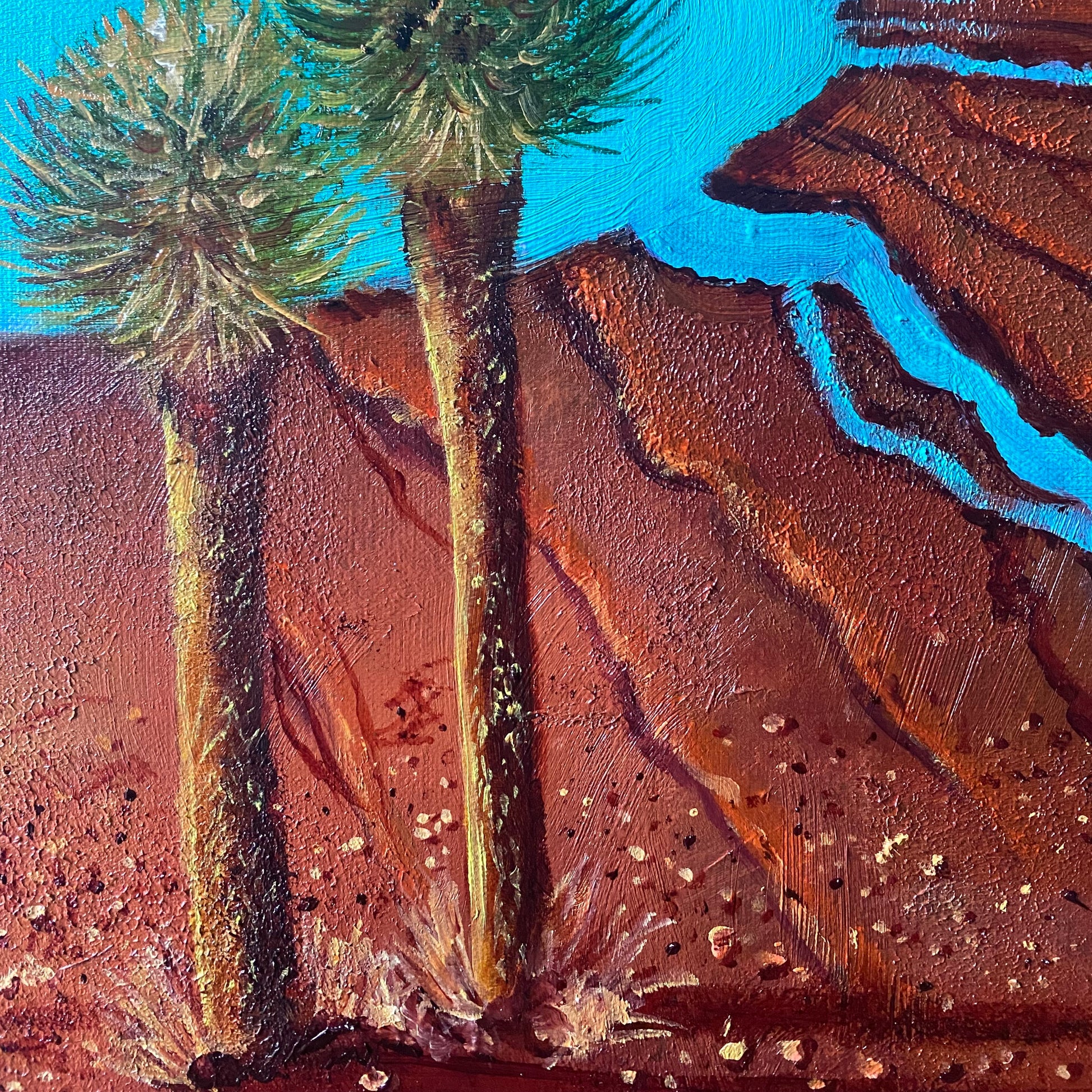 This painting captures the stunning beauty of the Australian red desert, with a sparkling turquoise billabong at its heart. The foreground features native Grass Trees, which creates a striking contrast between the vibrant turquoise water and the rich, burnt sienna colour of the earth. With a textured background bringing this unique landscape to life.