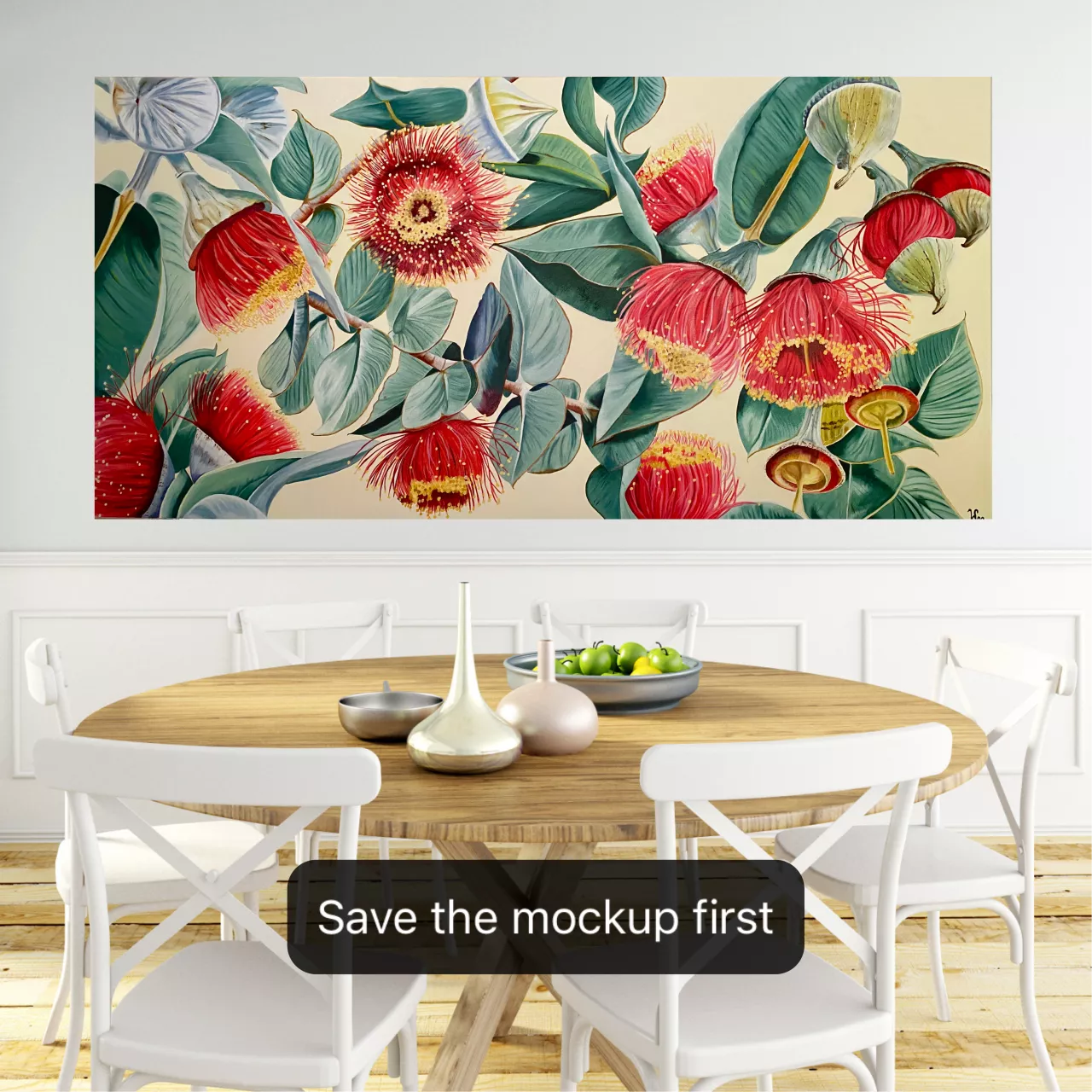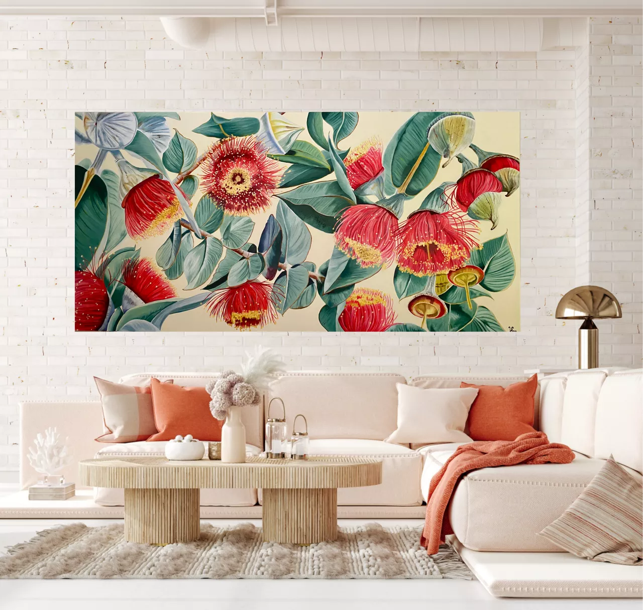 How can you not love gum nuts, such an iconic Australian tree and so many different varieties, an endless source of inspiration and a joy to paint, large scale they look even more spectacular, the blue grey leaves with those bright red blooms make the artwork come alive. Finding these on my daily dog walks inspired me to create this painting. It would look fabulous in a classic or contemporary setting as a standout conversation piece.