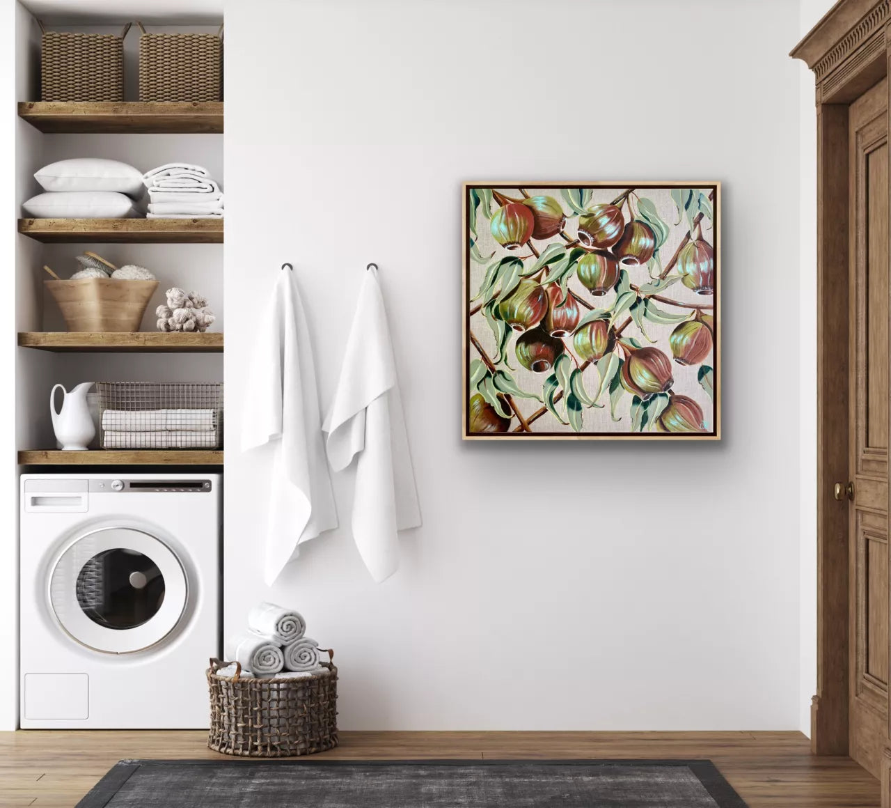 In my painting Gum Nut Harvest, I've tried to capture more than just the image of these eucalyptus seed pods. It's a personal reflection on the healing power I find in nature. Each gum nut speaks to me of the strength and quiet resilience we can find in the natural world.By immersing myself in nature, whether physically or through my art, I tap into a wellspring of healing and renewal.The gum nuts, with their promise of new life, symbolize the potential for growth and transformation that I believe lies within us all.The raw linen canvas is left as a beautiful natural backdrop to the gum nuts.Framed in dark oak float frame. Measurement includes frame.Supplied with a Certificate of Authenticity.