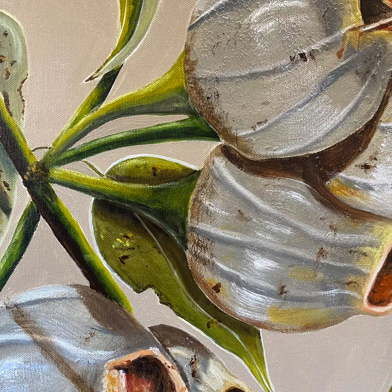 Gum Nuts are iconic elements of the Australian Landscape, there are so many varieties, unique shapes, colours and textures. I am drawn to the way light plays on the rough surface of the gum nuts, Eucalyptus trees are known for their ability to thrive in harsh conditions, and I wanted to capture the spirit of resilience in this painting.I have added texture behind the gum nuts giving a wonderful rough feel to them compared to the smoothness of the leaves. Another limited palette creation using mostly, greys, browns, greens and yellow on a warm neutral background. Framed in a high quality raw oak float frame. If you would prefer this painting without the frame, please message me through this website for the price excluding the frame. The sides of the painting as painted the same colour as the background. Framed size is 98cm (H) x 200cm (W) x 6cm (D). It would suit a contemporary, classic, or corporate settingSupplied with a Certificate of Authenticity. Thank you for visiting and I hope you love Gum Nut Symphony.