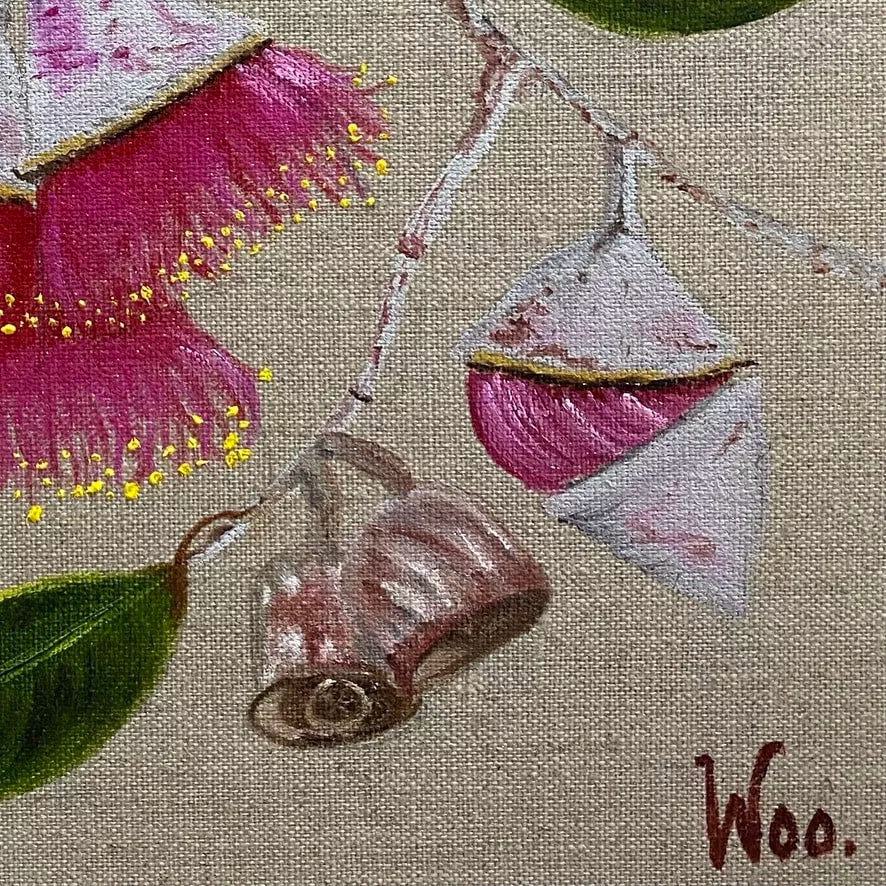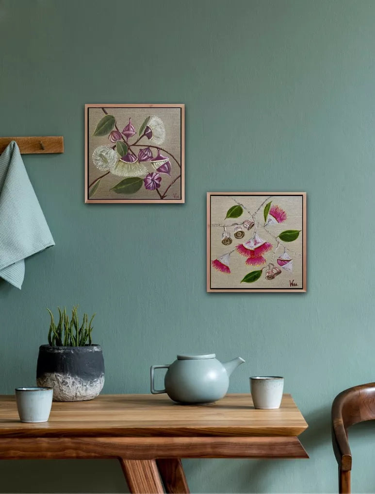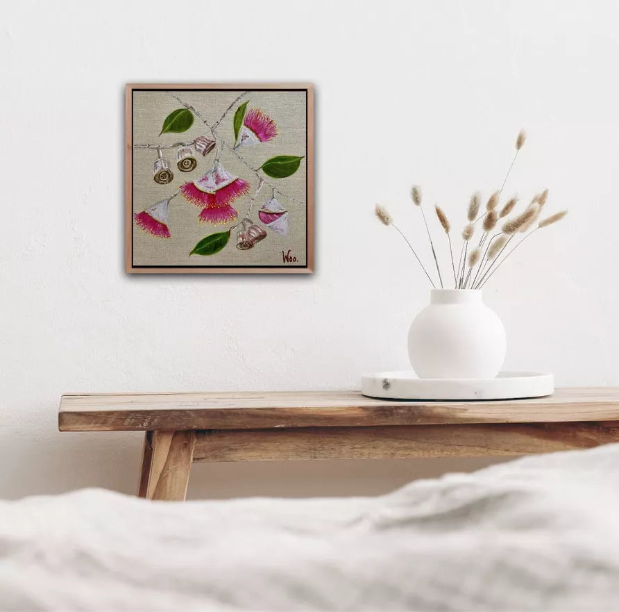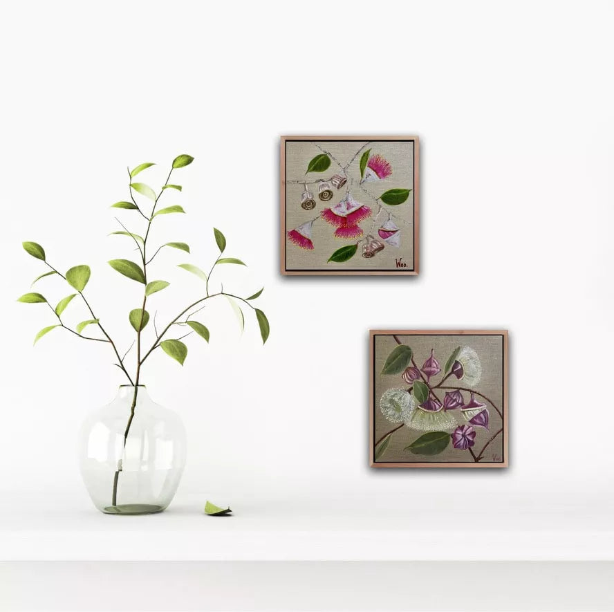 Gummy Nuts - A small study of the incredible beauty of Australian Natives. These gum nut blossoms are so magical that a nut can open to reveal such a delicate flower. Such a pretty painting would look gorgeous in a bedroom on the wall or standing on a dresser. Pair it with Nutsy Gums for impact.
