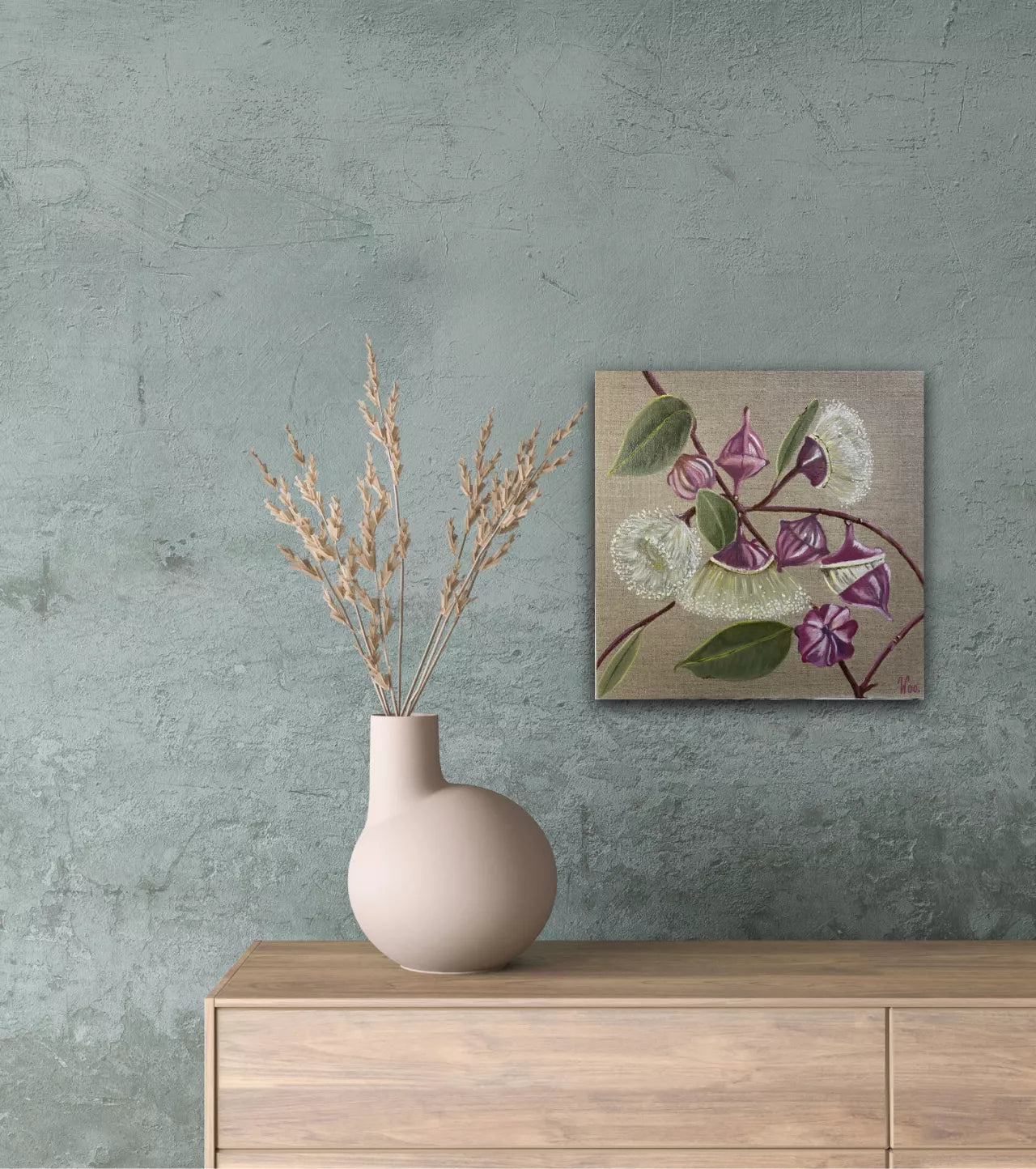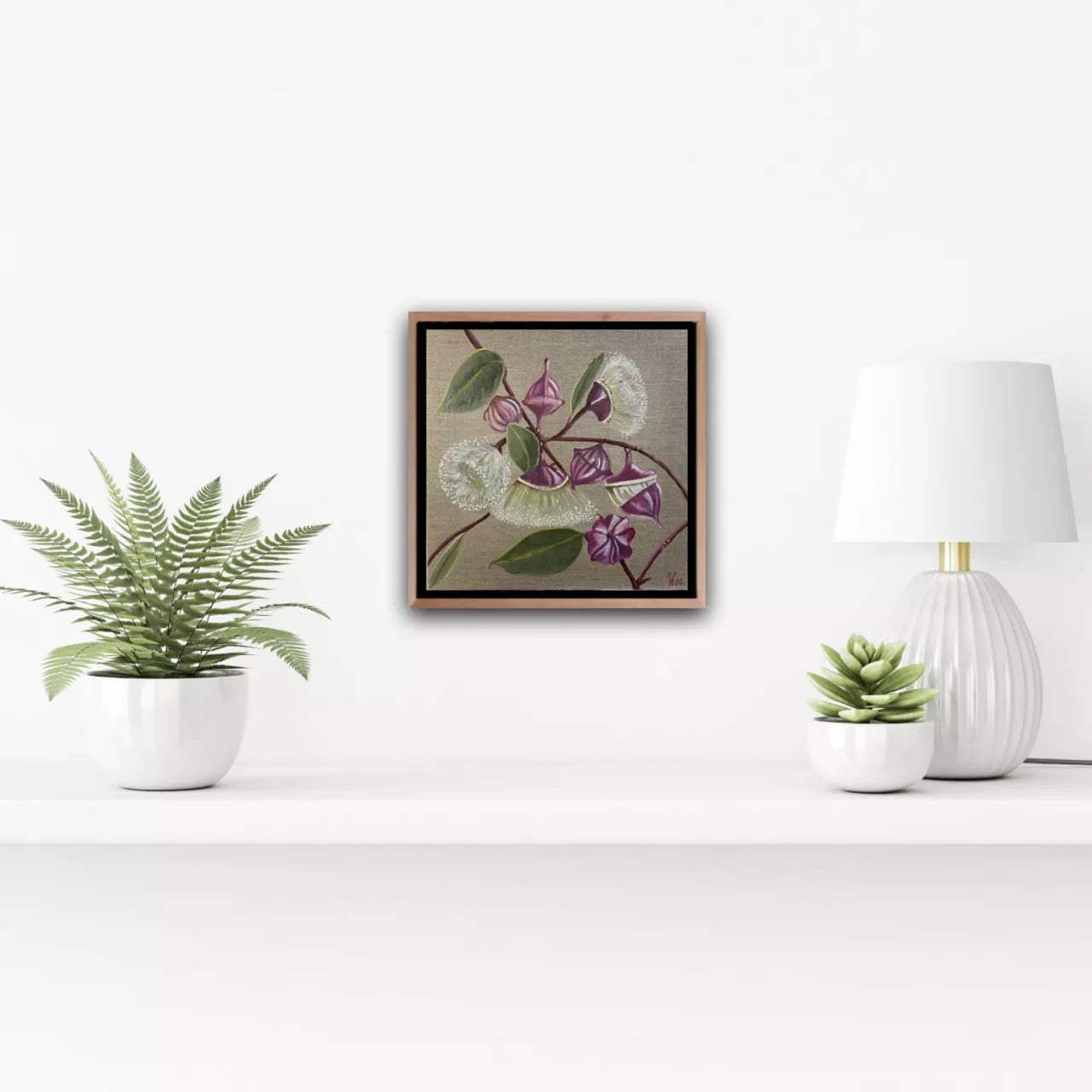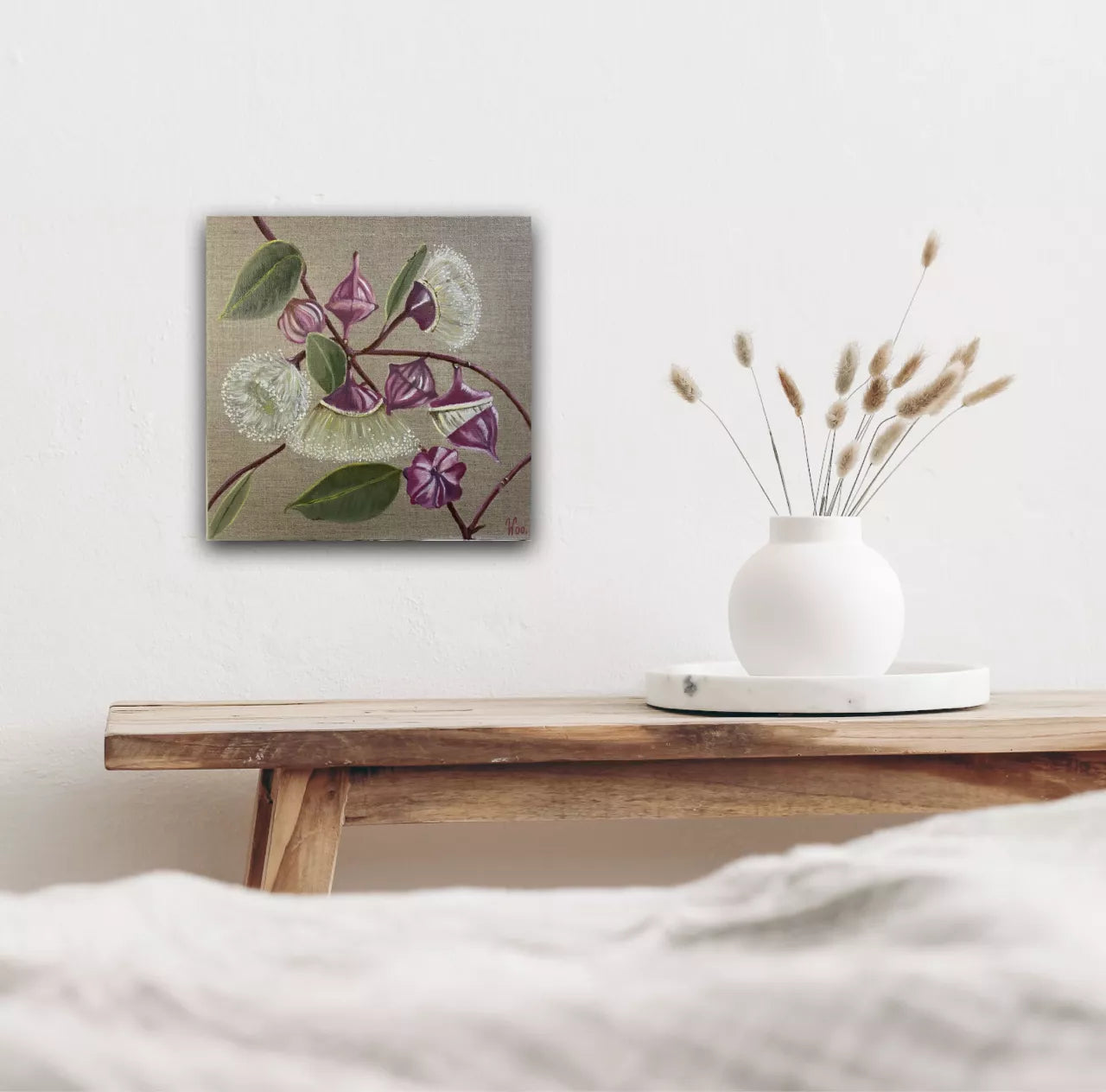 Nutsy Gums. A small study of the incredible beauty of Australian Natives, these gum nut blossoms are so magical that a nut can open to reveal such a delicate flower. Such a pretty painting would look gorgeous in a bedroom on the wall or standing on a dresser. If you are interested to have more than one of this type, please feel free to make contact to commission another one.