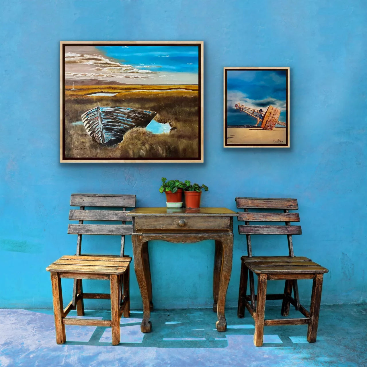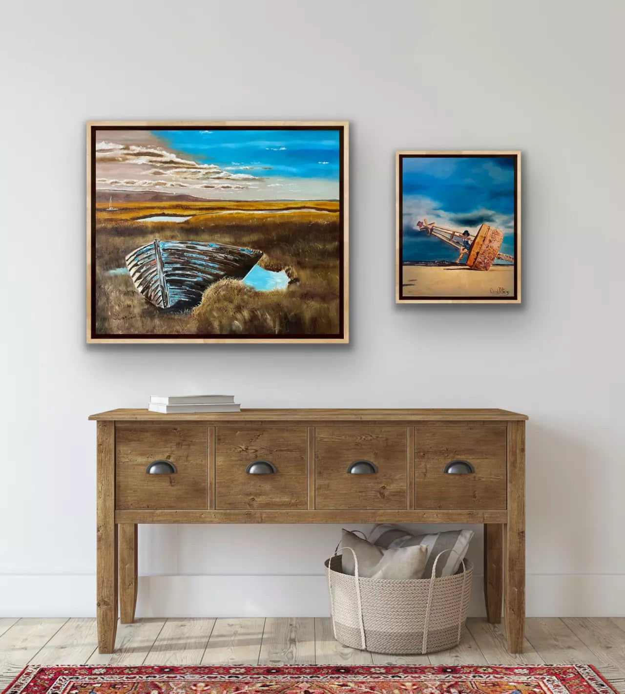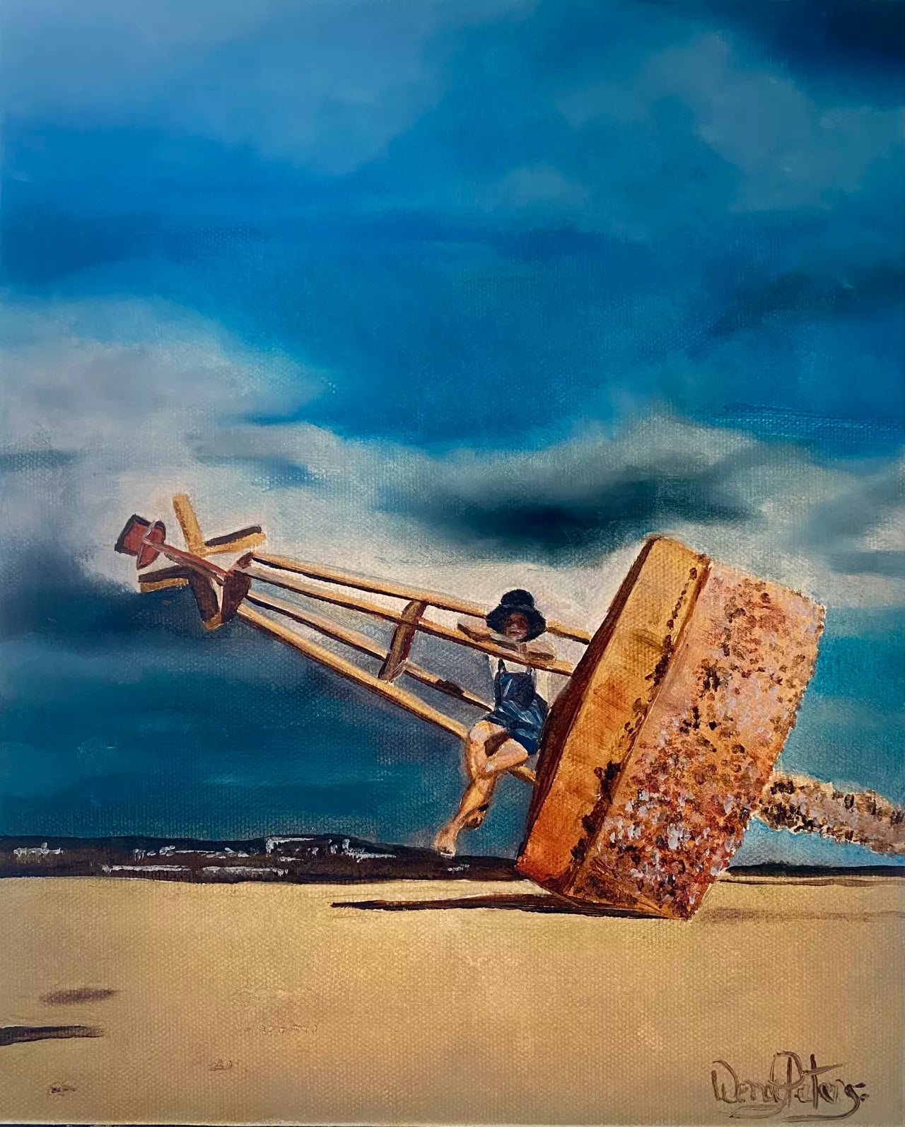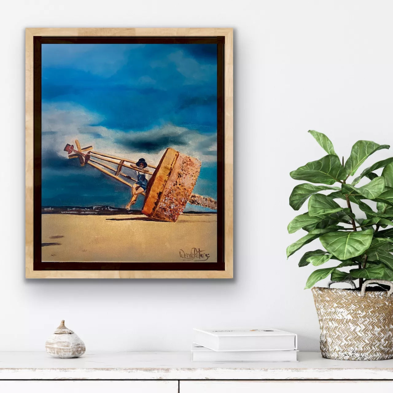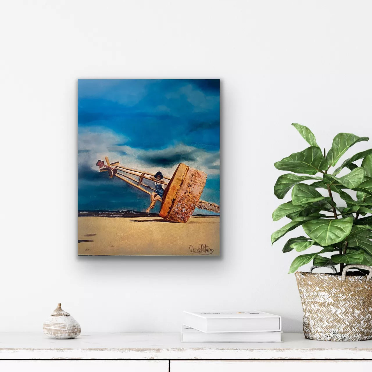 Have you ever encountered something unexpected on the beach, a whisper of the sea's secrets washed ashore? My latest painting captures just such a moment.In the heart of the canvas, a solitary figure sits atop a colossal buoy, its surface a canvas for time itself, etched with the stories of countless journeys. Encrusted barnacles, in hues of rust and cream, speak of the ocean's relentless embrace.The woman, her back to the viewer, gazes out at the endless horizon, her silhouette framed by the vastness of the sky. Her posture exudes a sense of quiet contemplation.Is she a seasoned sailor, Or perhaps a dreamer, lost in the whispers of the wind and the rhythmic crash of waves?This painting is more than just a seascape; it's an invitation to explore themes of solitude, connection to nature, and the allure of the unknown. I invite you to step into the scene, to feel the warm sand beneath your feet, and to contemplate the captivating encounter between the woman and the sea.One of a Kind original painting. - Comes with a Certificate of AuthenticityThis painting is on stretched artist quality canvas with internal wooden frame.It would also look fabulous in a timber floating frame.All of Wendy’s original artworks are signed on the front and signed and named on the back.