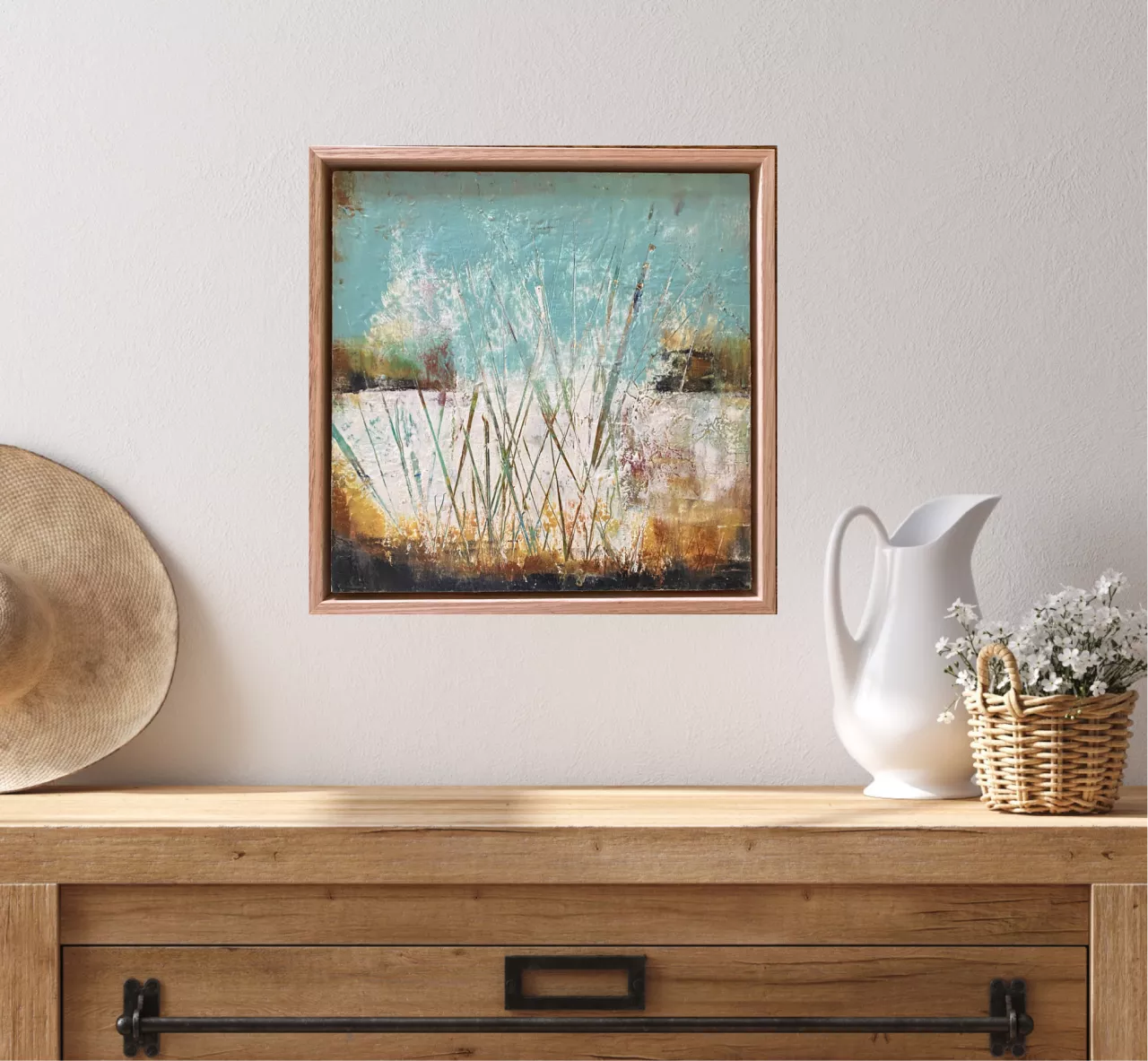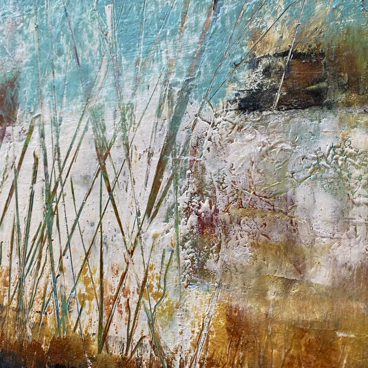 This collection embraces my love of the natural world and how it helps to heal if we take time to be amongst it and absorb its beauty and spellbinding power. Leaving behind a feeling of burnout, overwhelm with debilitating migraines and being in the present in nature is represented in these abstracted visions I see and feel. Working with cold wax and oil on wood panels allows for beautiful texture and depth to shine through. Framed and ready to hang in raw Tasmanian oak float frame.