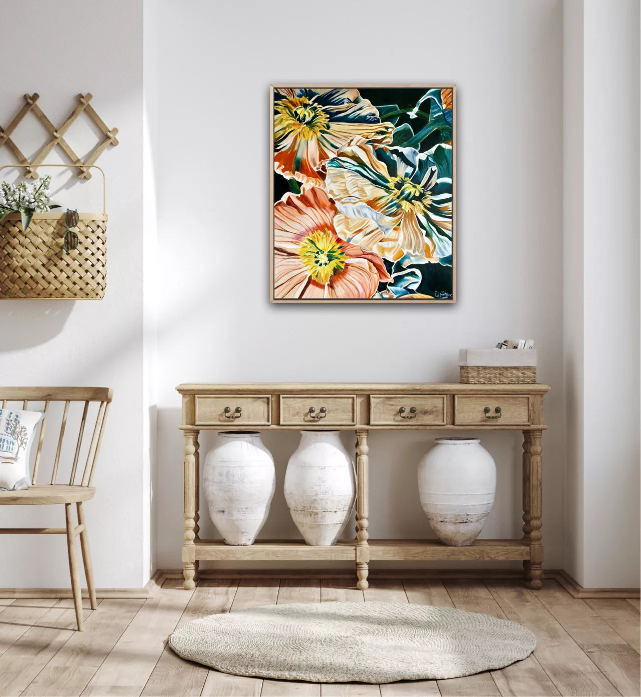 Painted in an unconventional palette of peach, burnt sienna, and blues, this artwork showcases three poppies in full bloom. The colours are rich and bold, capturing the essence of these captivating and delicate flowers. One of a Kind original painting.Comes with a Certificate of Authenticity. This painting is on stretched artist quality linen canvas with internal wooden frame. It would also look fabulous in a timber or black floating frame.All of Wendy’s original artworks are signed on the front and signed and named on the back.