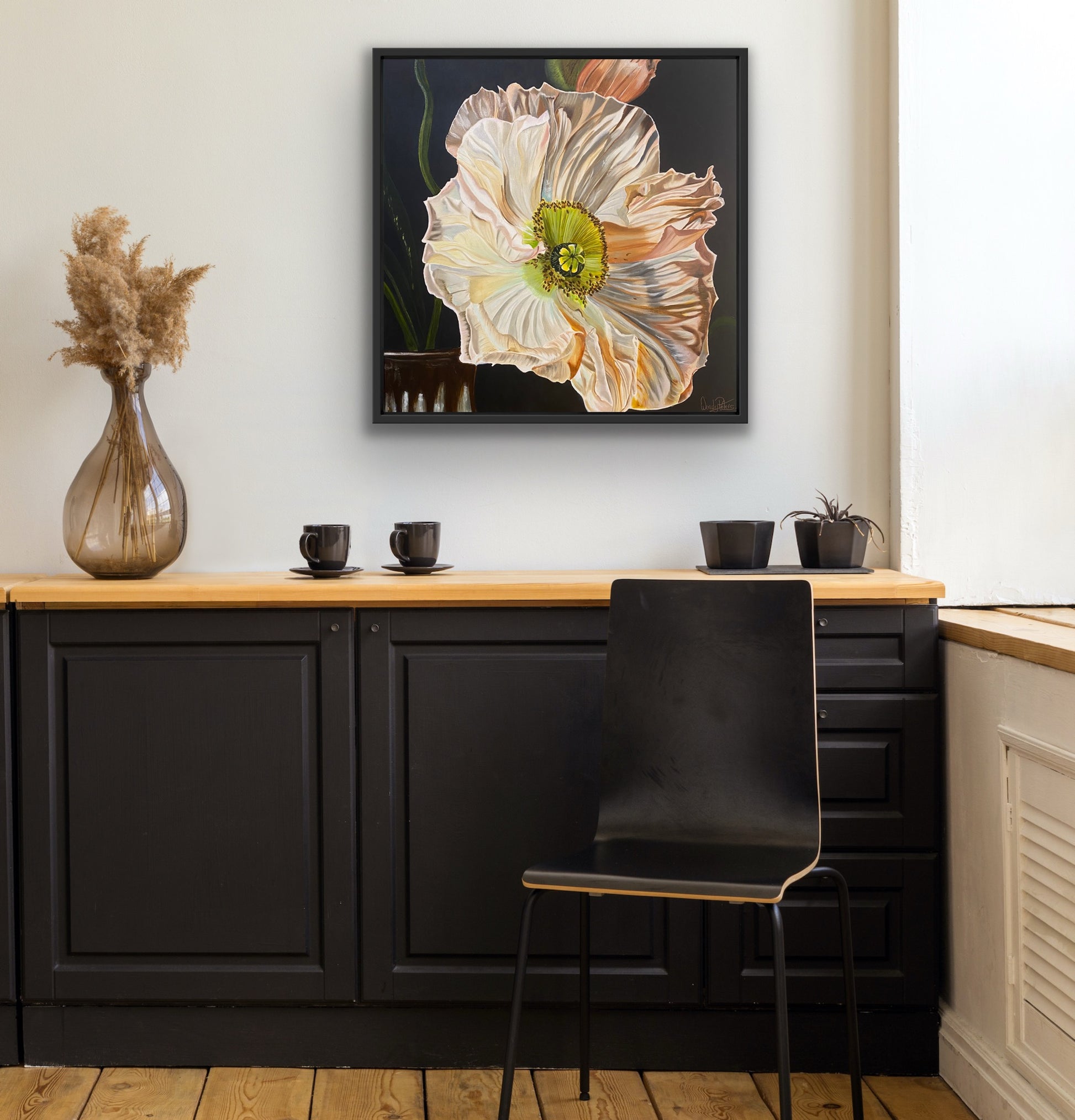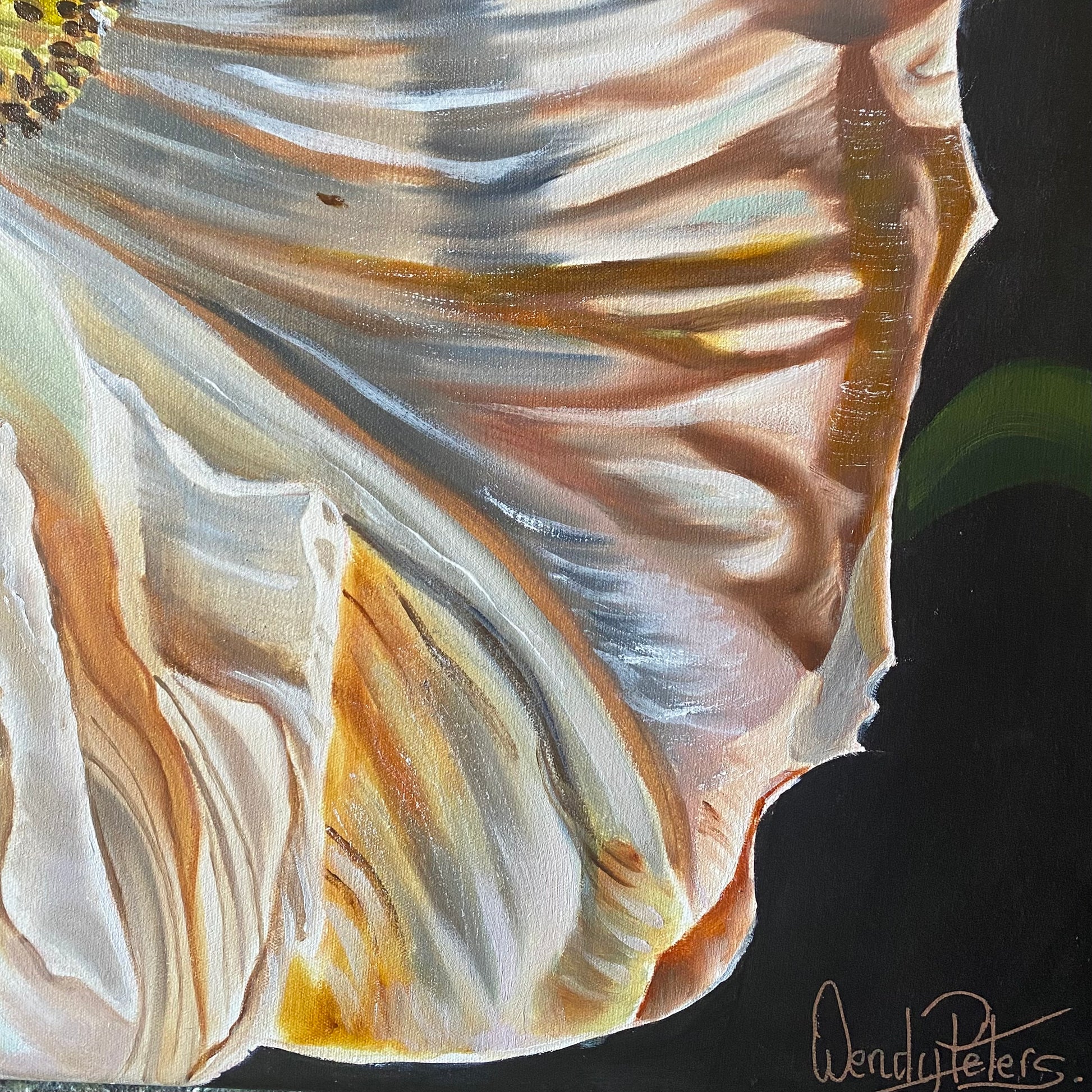 I was captivated by how using a strong interplay of light and shadow could transform this scene. The warm grey and mocha tones in the shadows, create a beautiful depth and contrast against the white, pleated petals that are bathed in light. It's all about those subtle shifts in colour and texture that bring the flower to life.