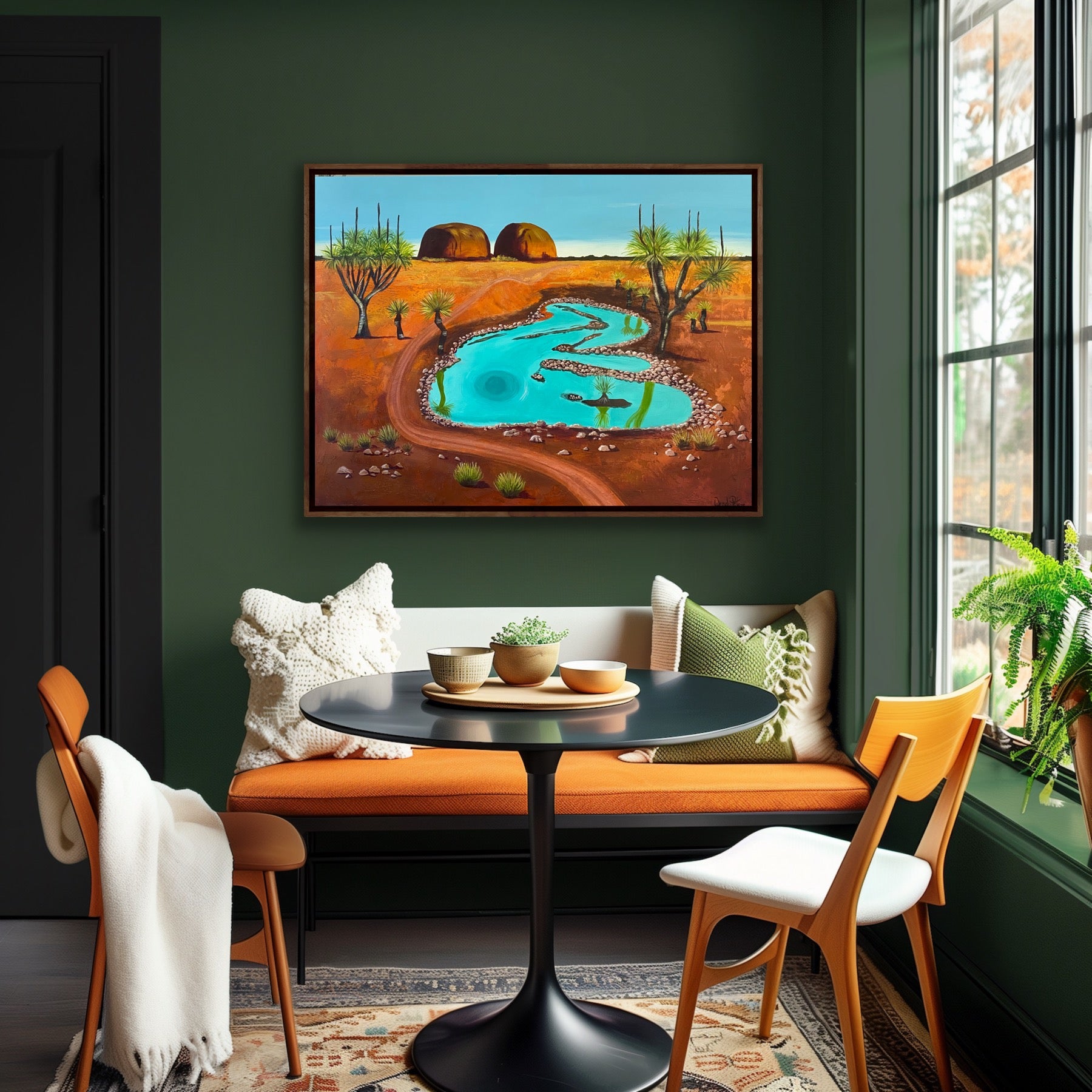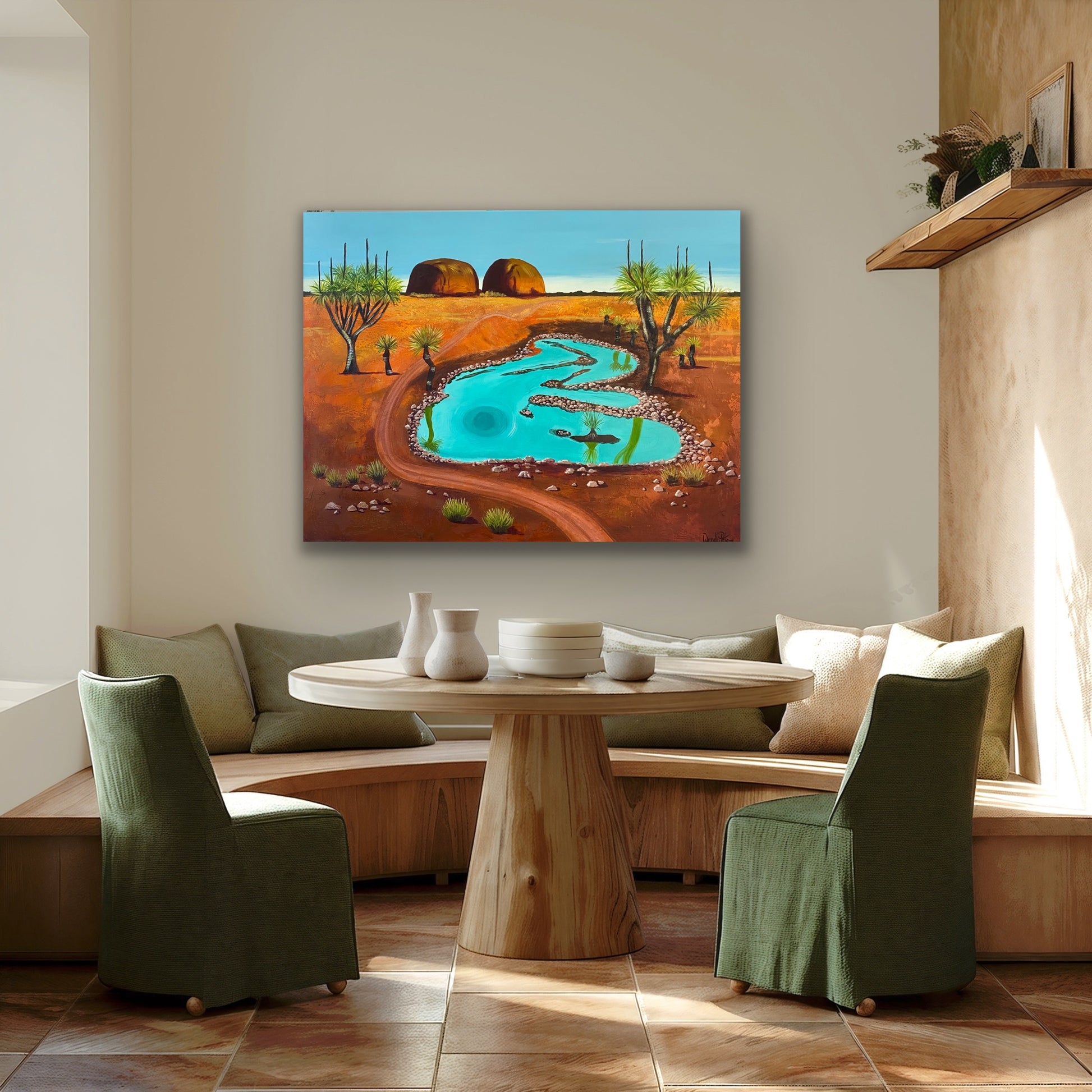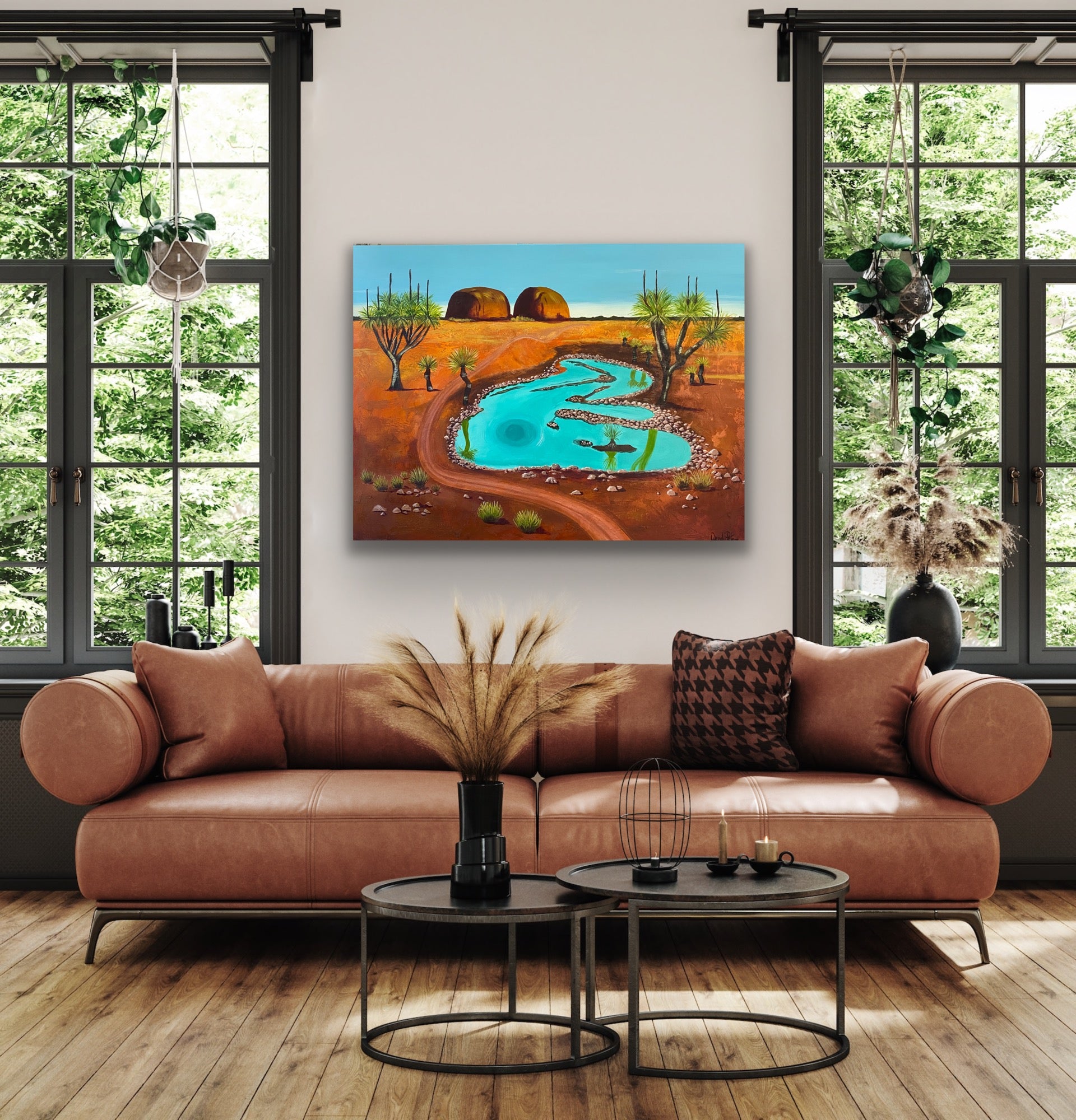 This painting features the majestic red mountains in the background, standing as ancient sentinels over the vast landscape. The desert stretches out in a vibrant burnt sienna, reflecting the scorching sun and the rich, iron-laden earth. It's a land of contrasts, and nowhere is that more evident than in the turquoise billabong that takes centre stage. This oasis, fringed with the unique and resilient grass trees, represents life and vibrancy amidst the arid expanse.
