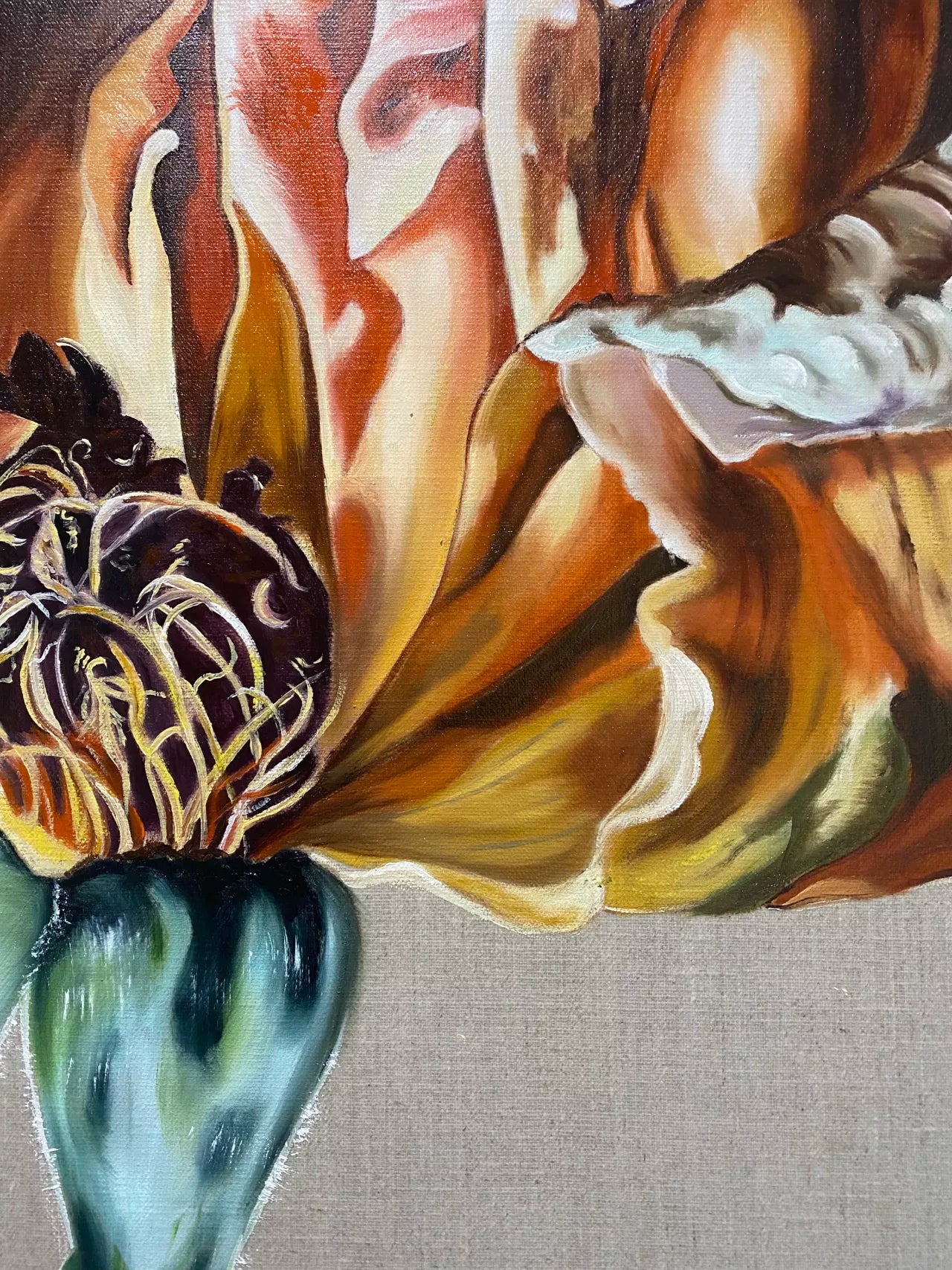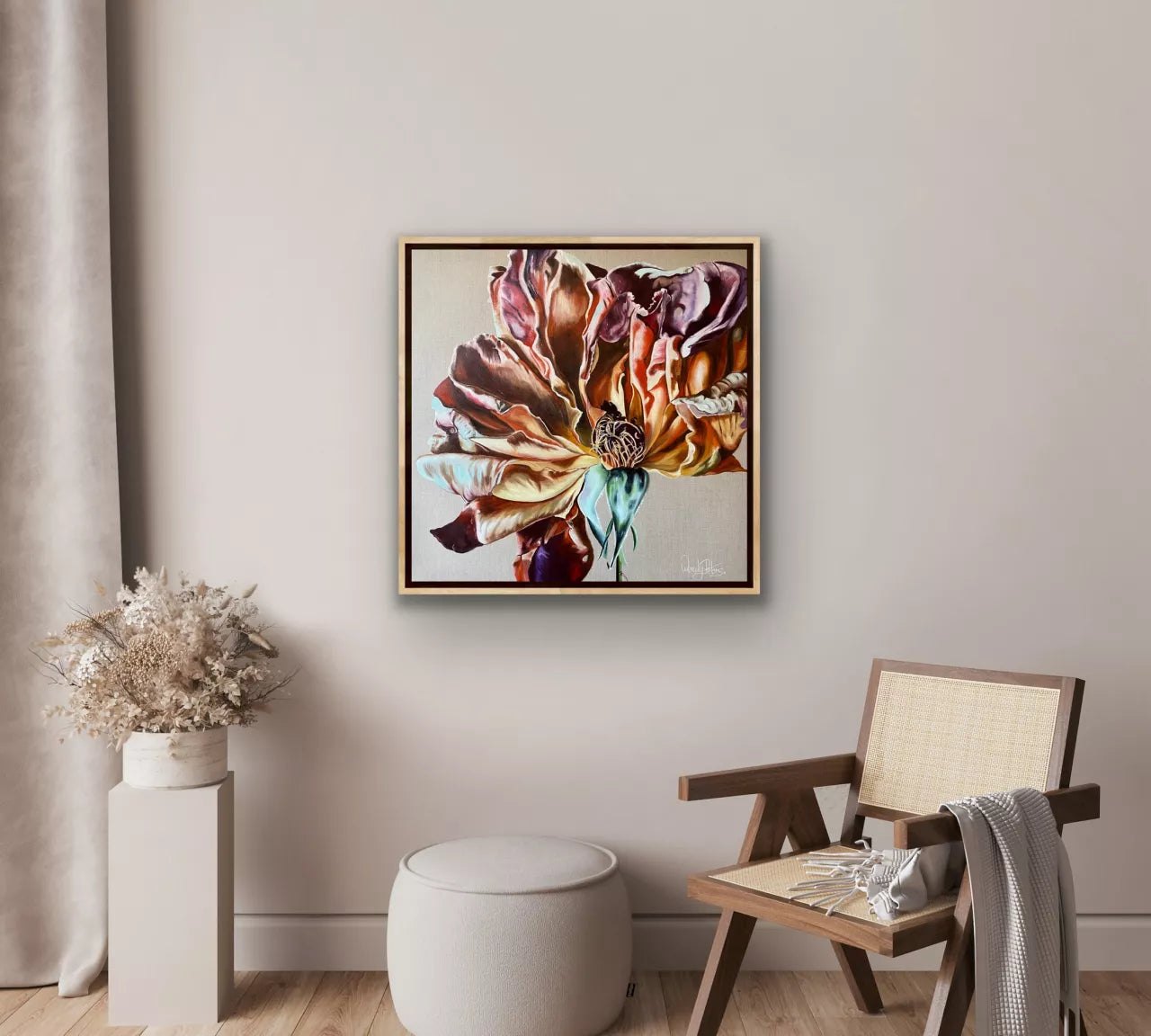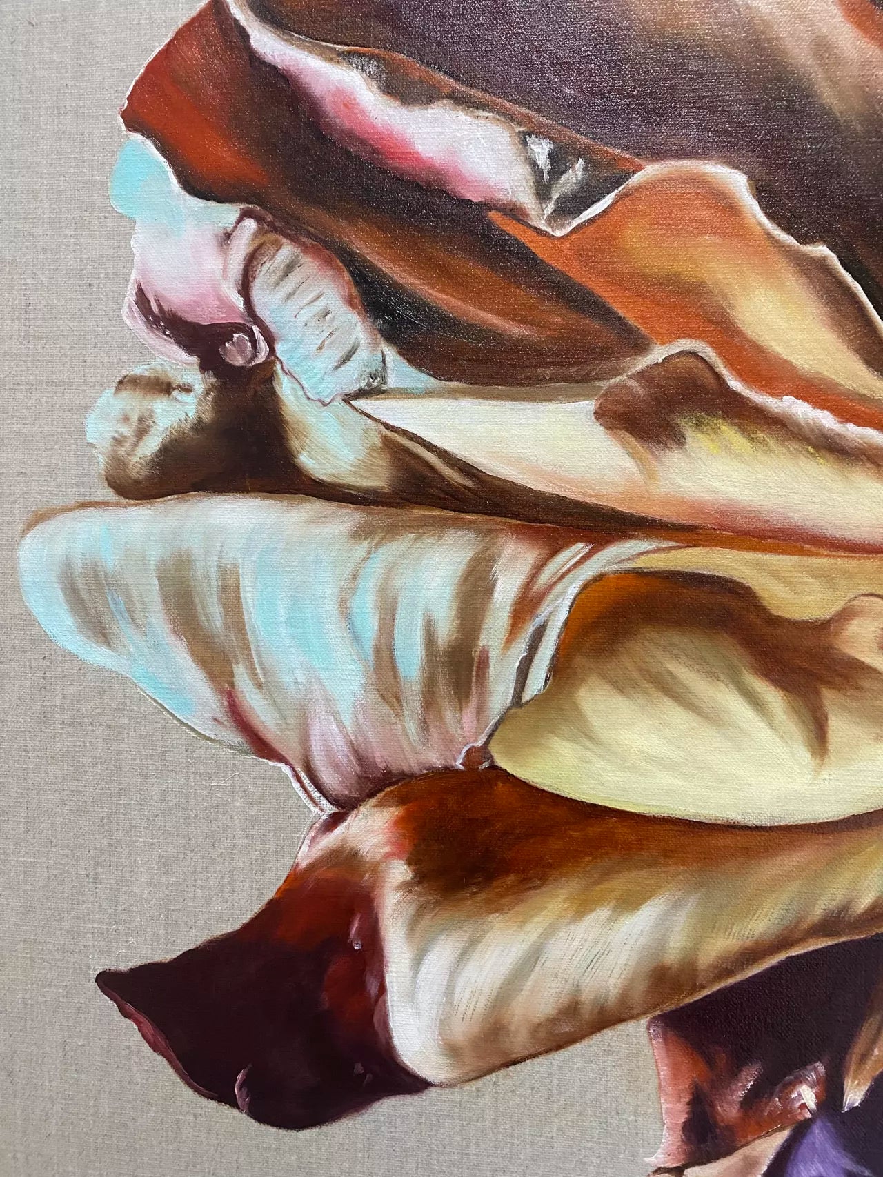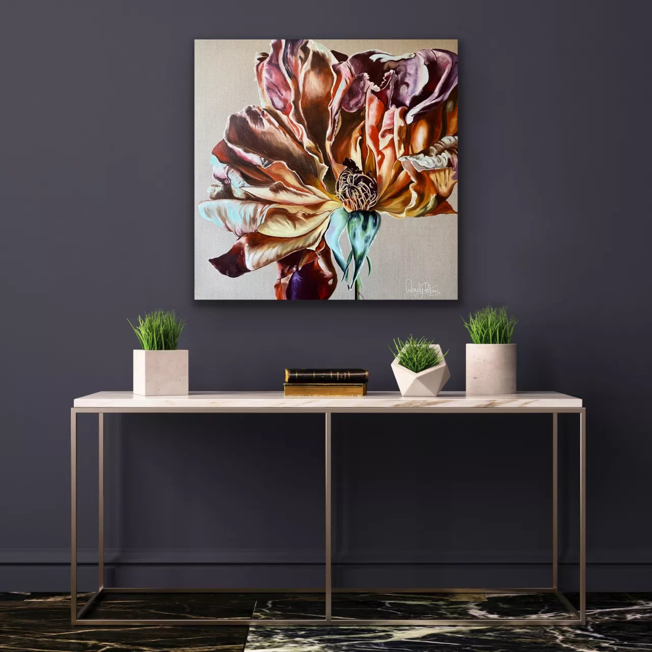This isn't a painting of decay, but of transformation. The rose, even in its waning moments, maintains an exquisite beauty. The velvety colours, though softer at the edges, retain a depth and richness. The true star of the show is the way the petals curl inwards. Once proud and expansive, they now fold in on themselves, as if seeking solace in their own fading embrace. "Rose Exquisite" is a celebration of the impermanence of beauty, a reminder that even in decline, there is something precious to be found. It's a piece that invites you to contemplate the cycle of life, the inevitable fading that gives way to new beginnings.
