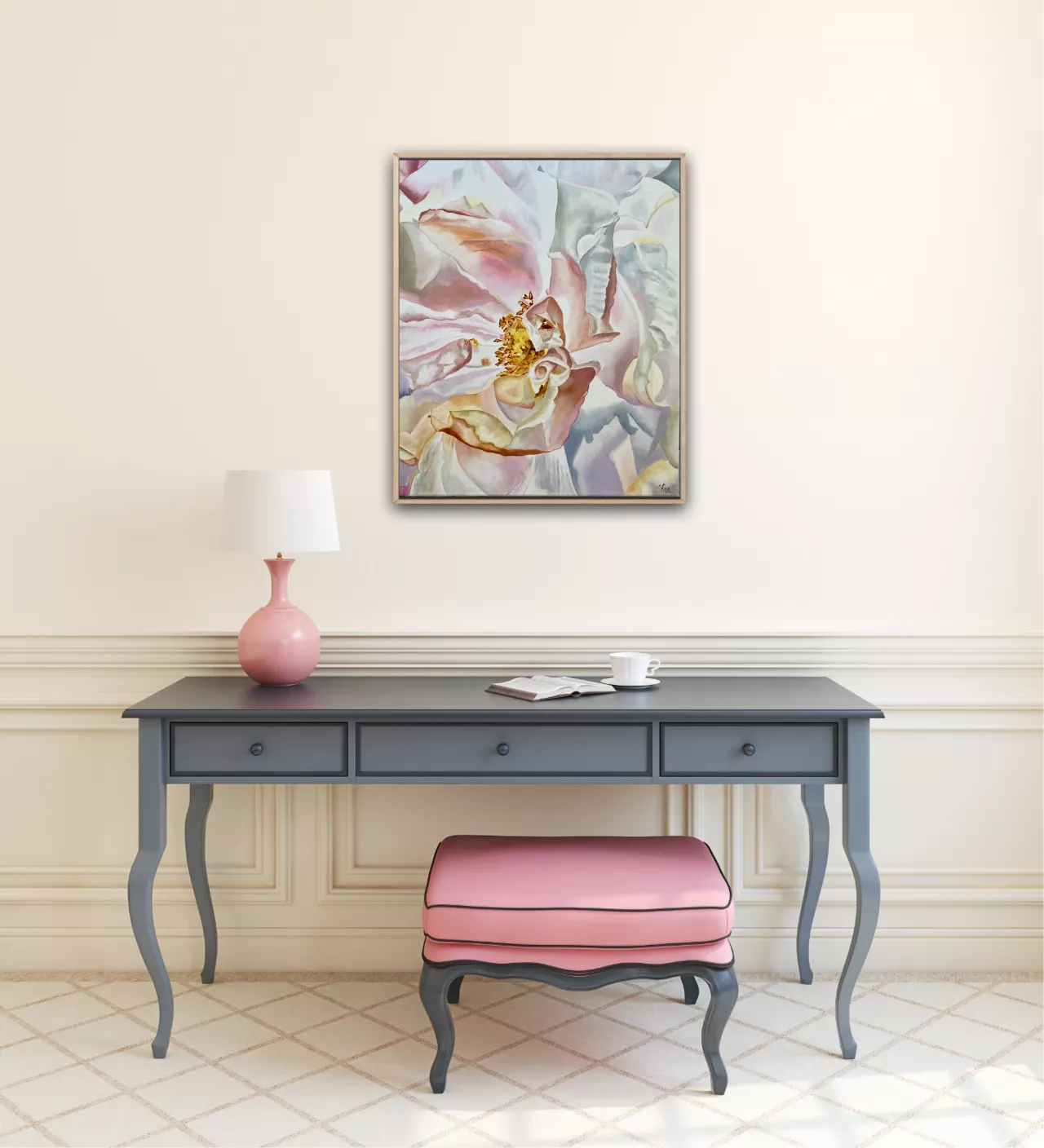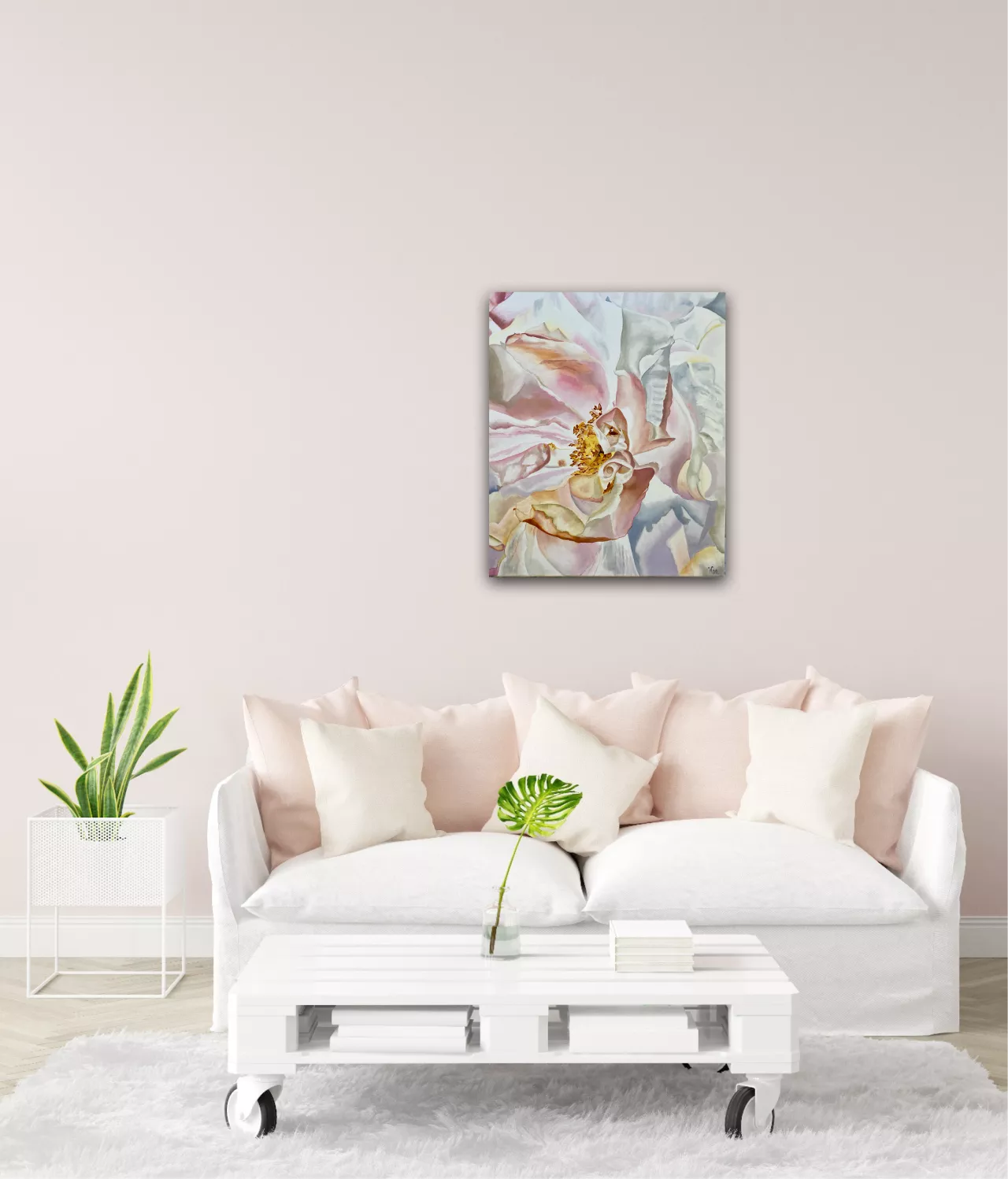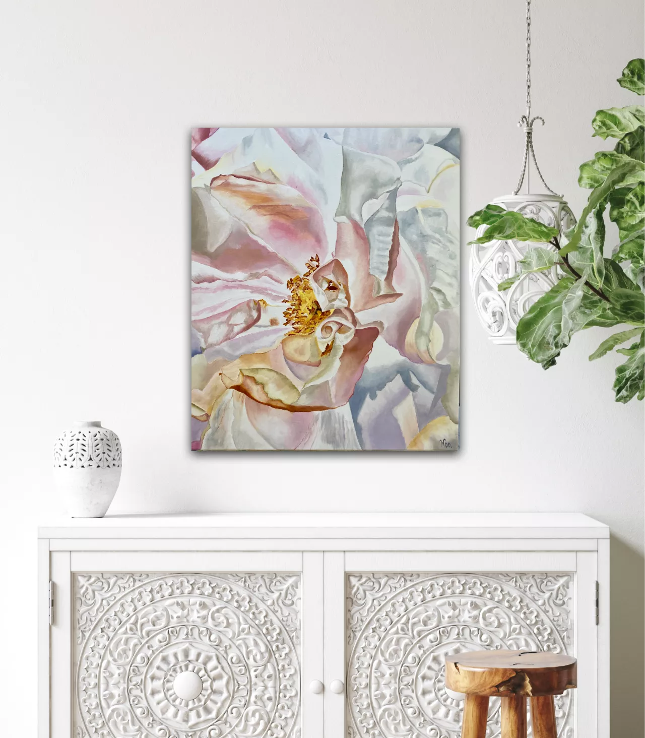 The beautiful backlight to this soft pink rose creates an ethereal feel to the delicate petals as though they could just float away. Capturing the beauty of flowers and the joy they bring to us also gives a sense of peace and calm. This artwork would look beautiful unframed or framed in a light oak float frame. Available exclusive from Art Lovers Australia.