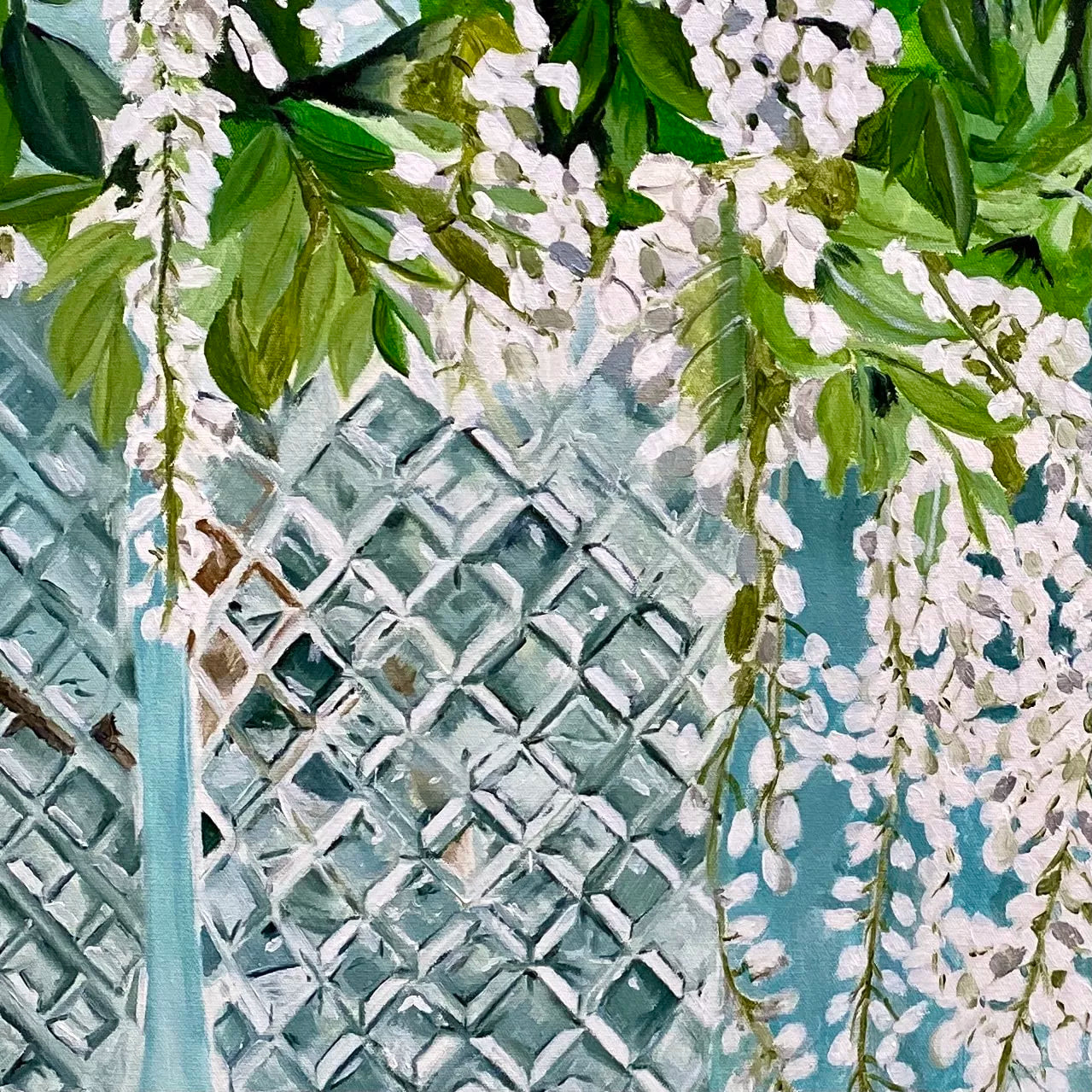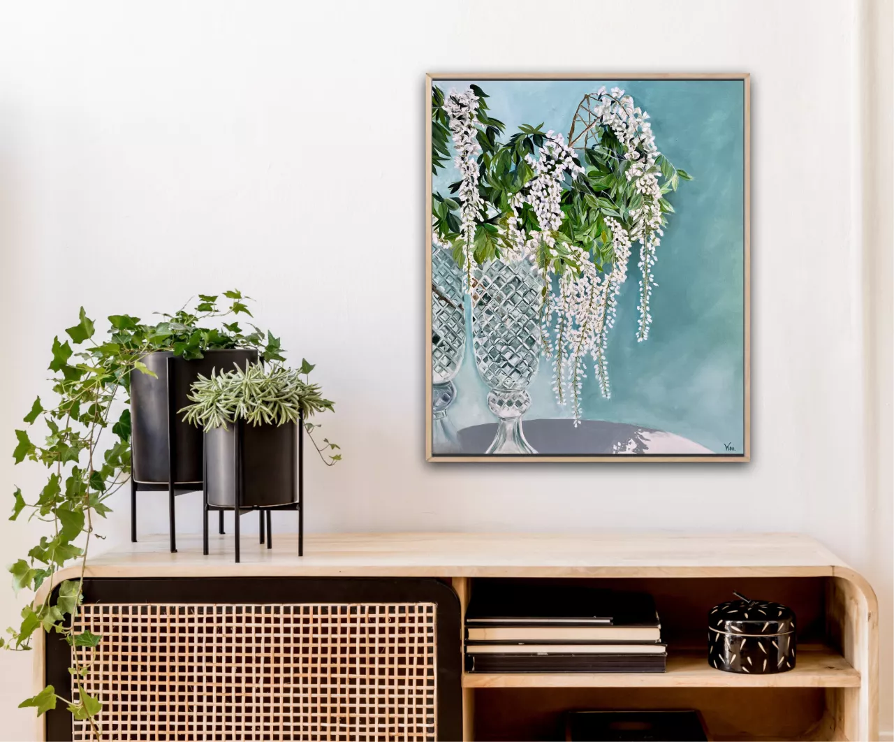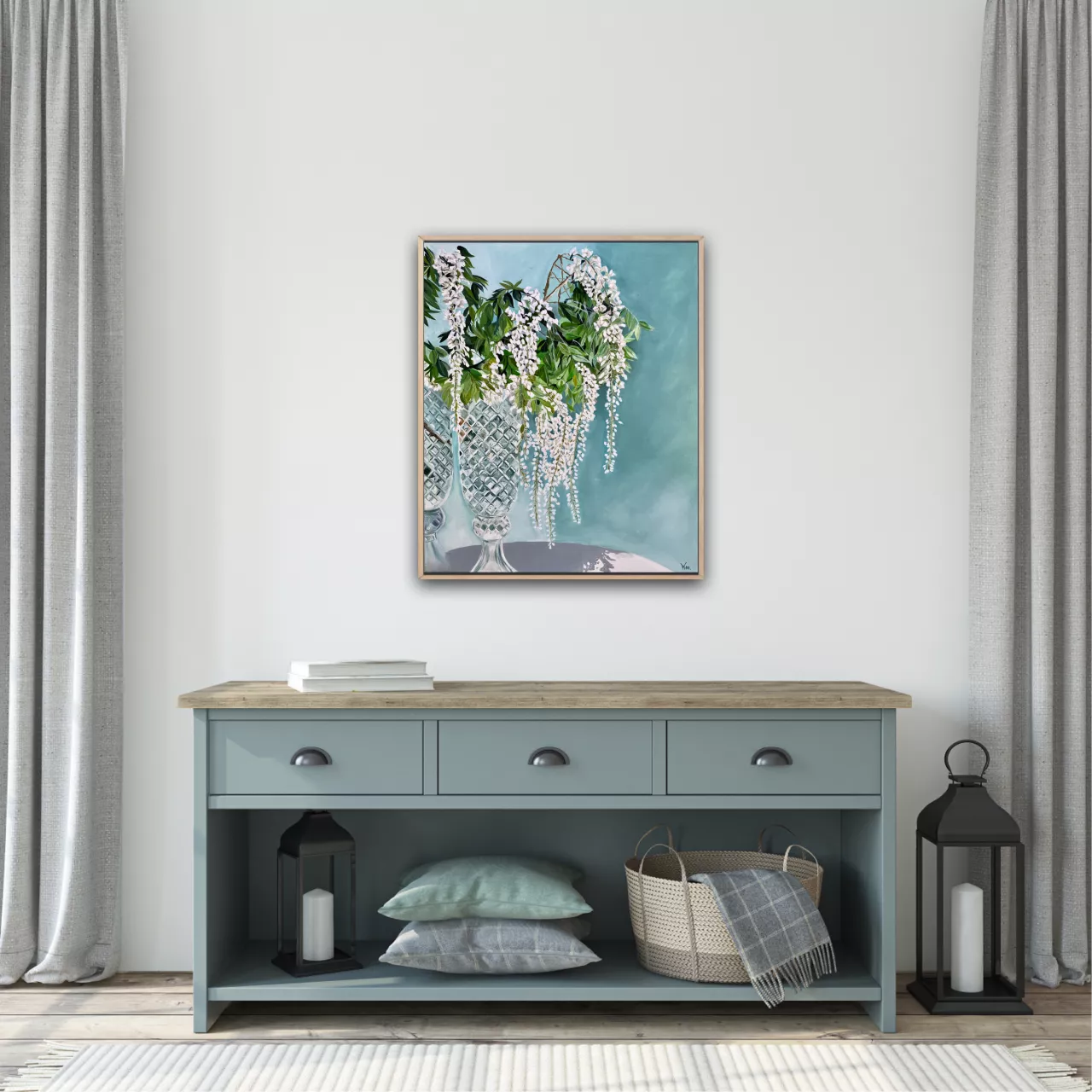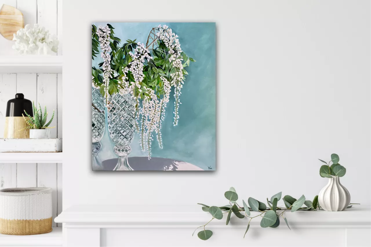 Cut Crystal is so beautiful the way the light plays with the shapes cut into the crystal, filled with overflowing delicate white Bridal Veil flowers, so serene creating a feeling within of stillness and hope, something we need at times. The bluey green Duck Egg Blue shade of the background is one of my favourite colours to paint with.