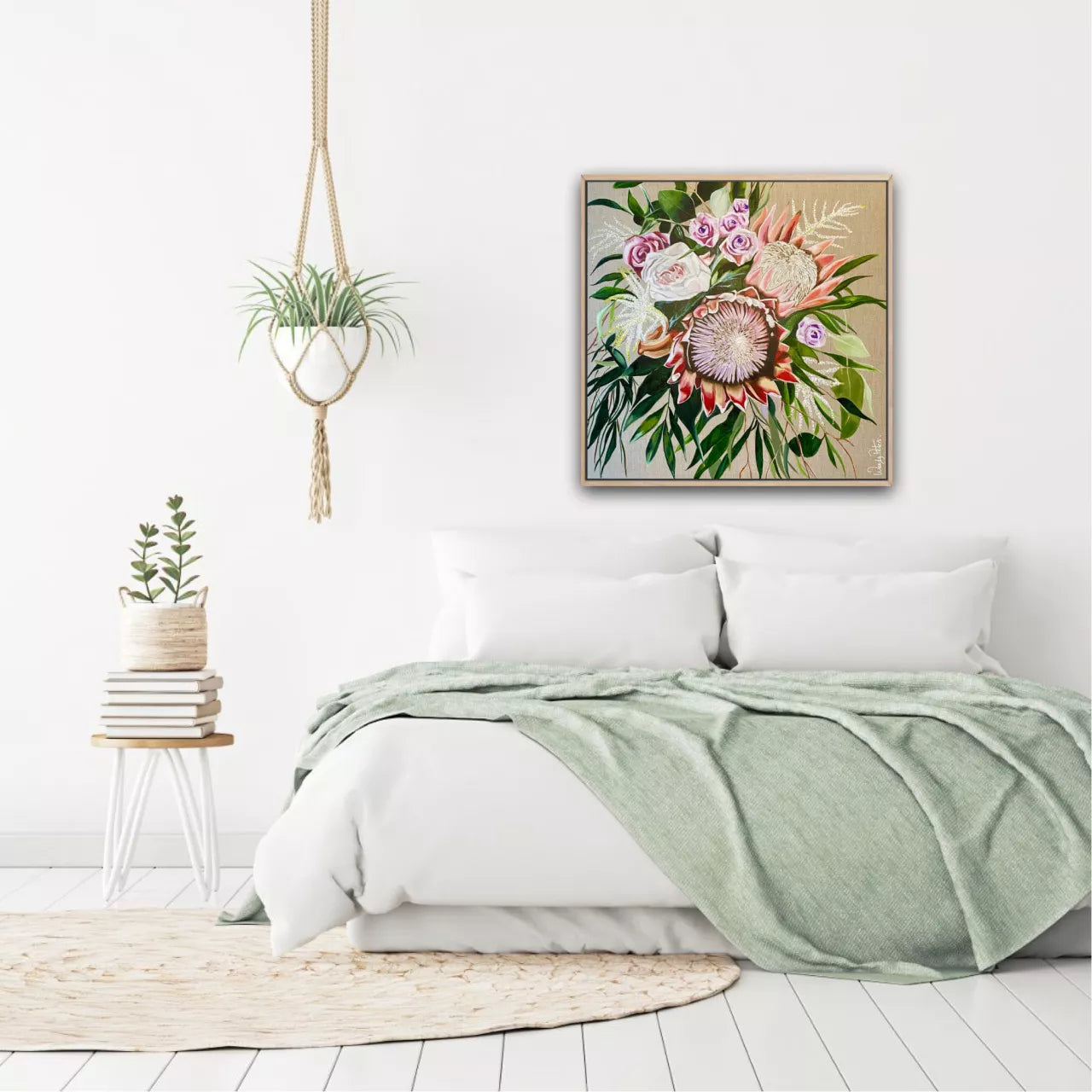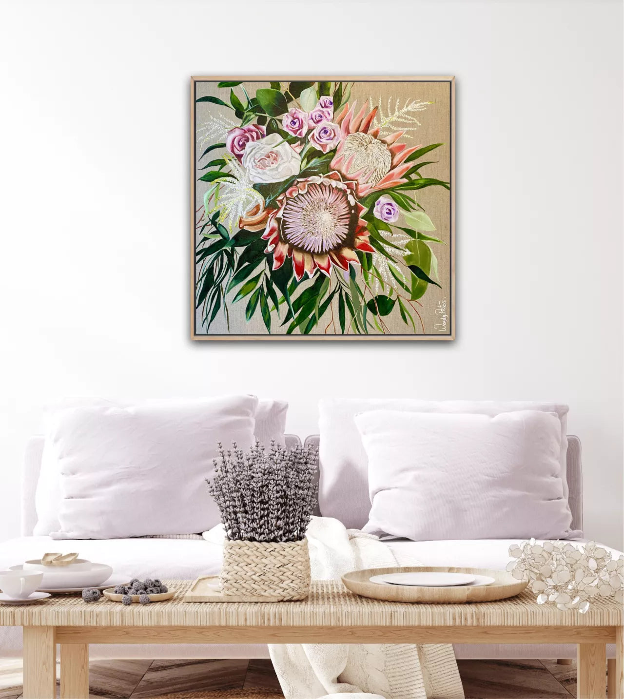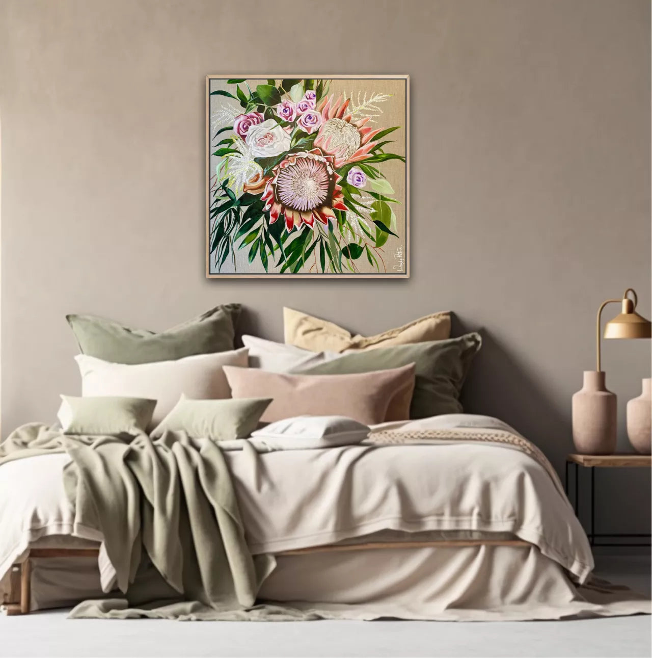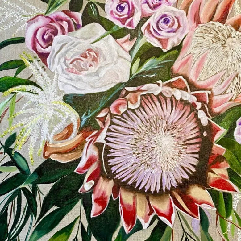 Against a backdrop of textured linen, a symphony of soft hues unfolds. Pale pink proteas, their fuzzy crowns act as centre stage. Their velvety petals, whispers of pink tinged with lavender and sage, radiate a subtle luminescence. Around them, roses unfurl in delicate counterpoint, swirls of pink, crimson and violet, their edges tinged with the faintest whisper of white. Surrounded by lush green foliage adds a beautiful contrast to the delicate petals.