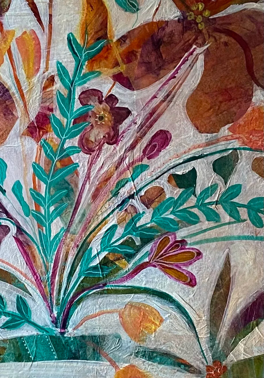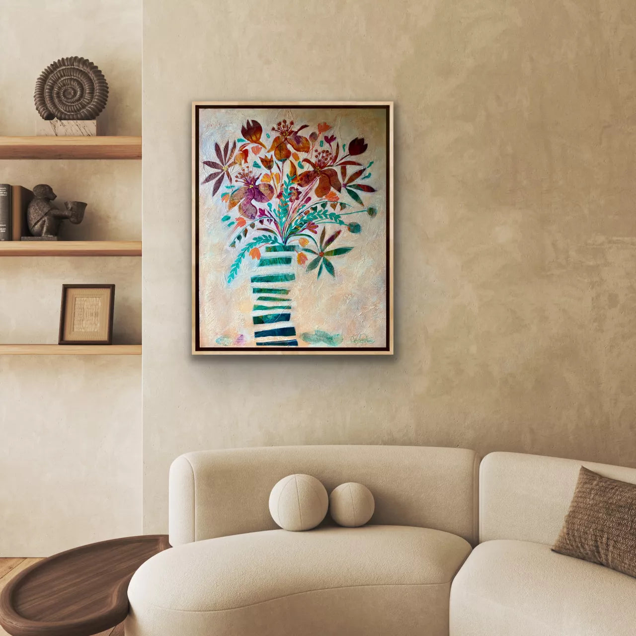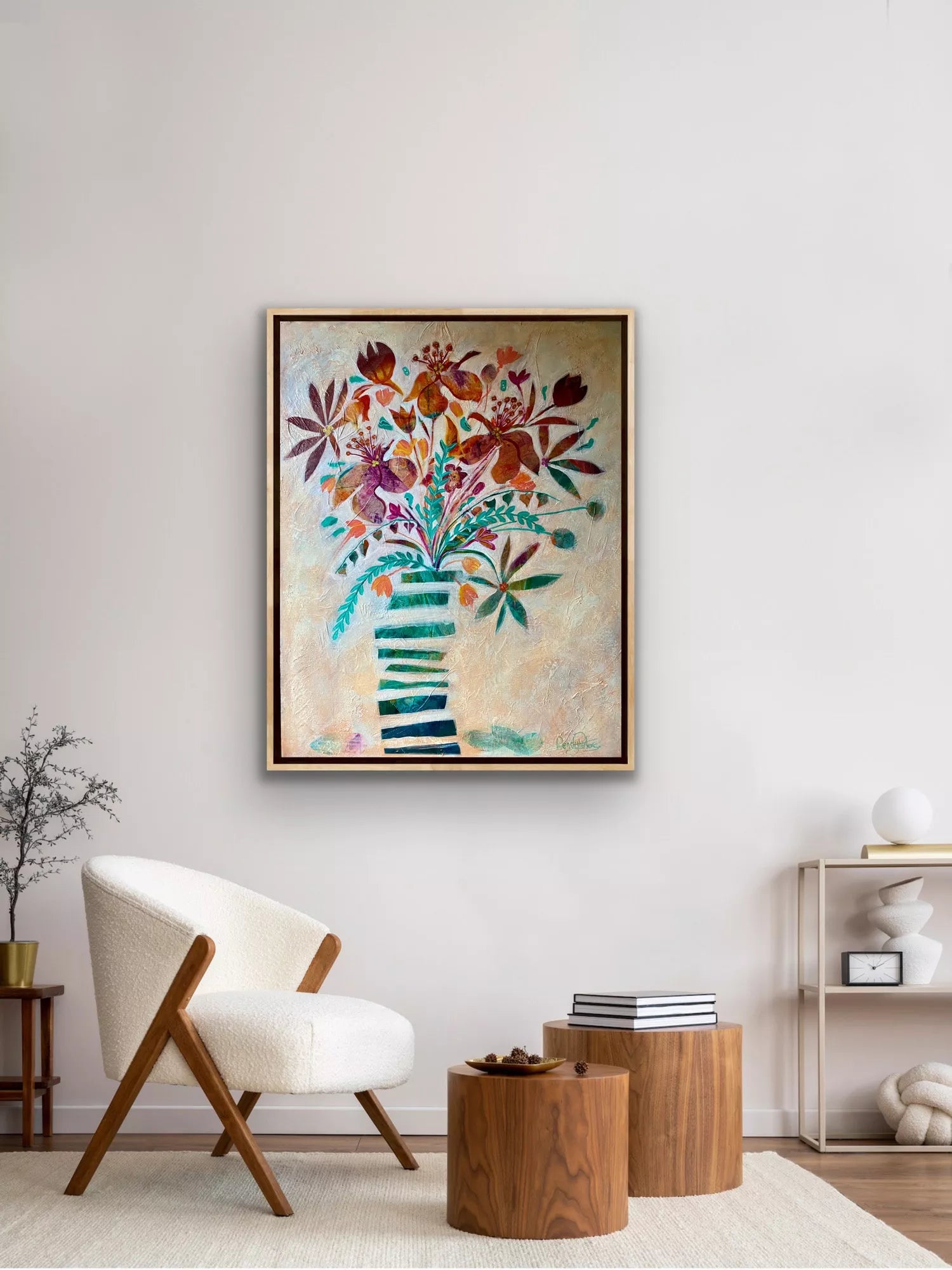 The mixed Bunch is inspired by my trips to the Farmers Market on Sundays, where the flowers are seasonal and so always changing, a mixed bunch will brighten any room. This mixed media piece is a fun and joyous piece and invites the viewer to take a closer look at all the fine details showing through the layers of glaze. A textured background add the eclectic look. Framed in a high quality oak float frame.Supplied with A certificate of Authenticity. Size stated includes frame.