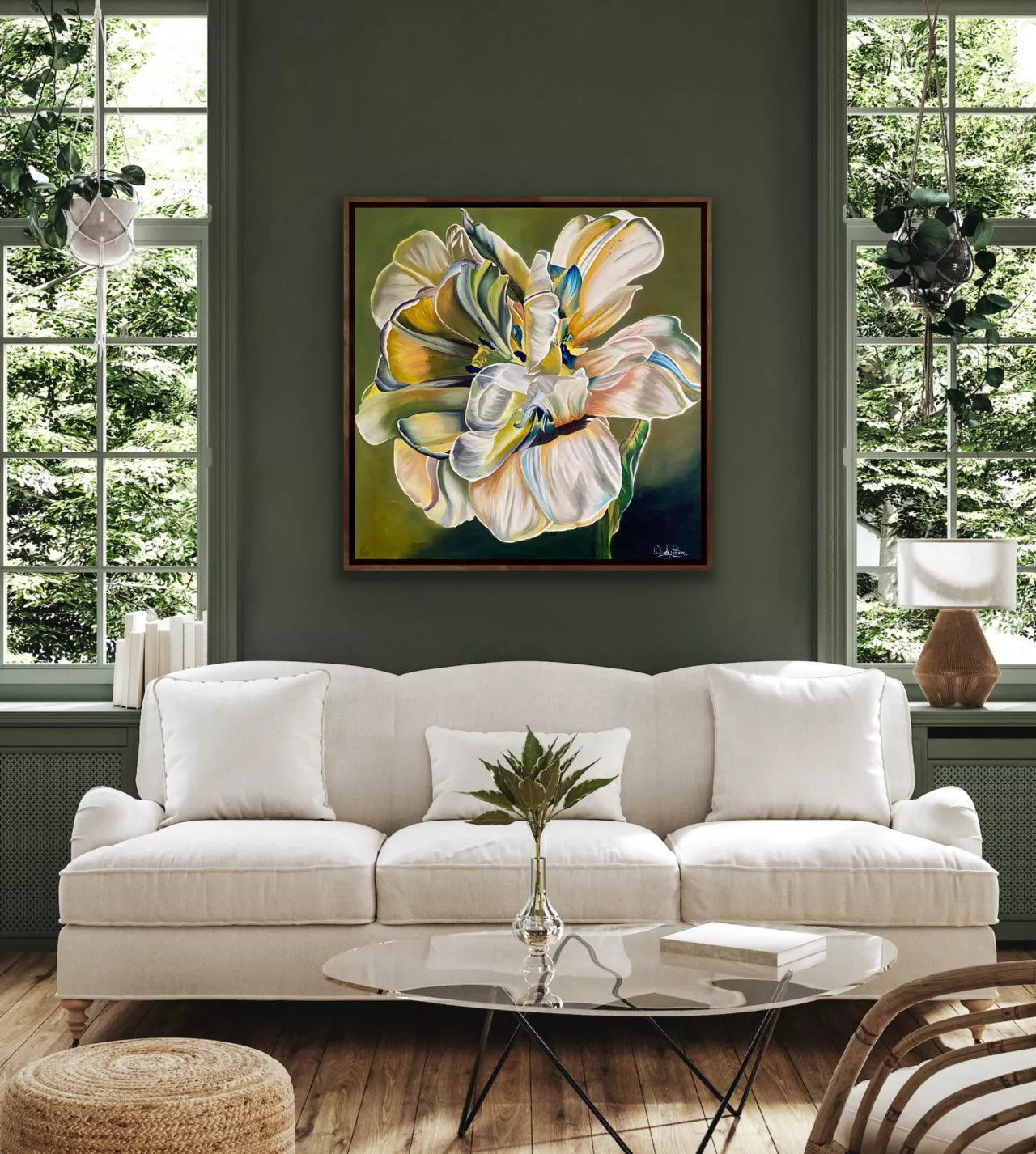 The light plays a key role in this painting. It bathes the tulip's petals, highlighting the delicate folds and textures, when the morning sun, casts a warm glow.This isn't just a painting of a flower; it's a capture of a moment. A moment of quiet beauty, where the ordinary transcends into something extraordinary. The green tulip, bathed in light, becomes a symbol of resilience, of finding beauty in the unexpected.This painting would work equally well in a contemporary or classic setting.Comes with a Certificate of Authenticity.This painting is on stretched artist quality canvas with internal wooden frame. It would also look fabulous in a timber or black floating frame. The edges are painted dark green so is also perfect hung unframed.All of Wendy’s original artworks are signed on the front and signed and named on the back.
