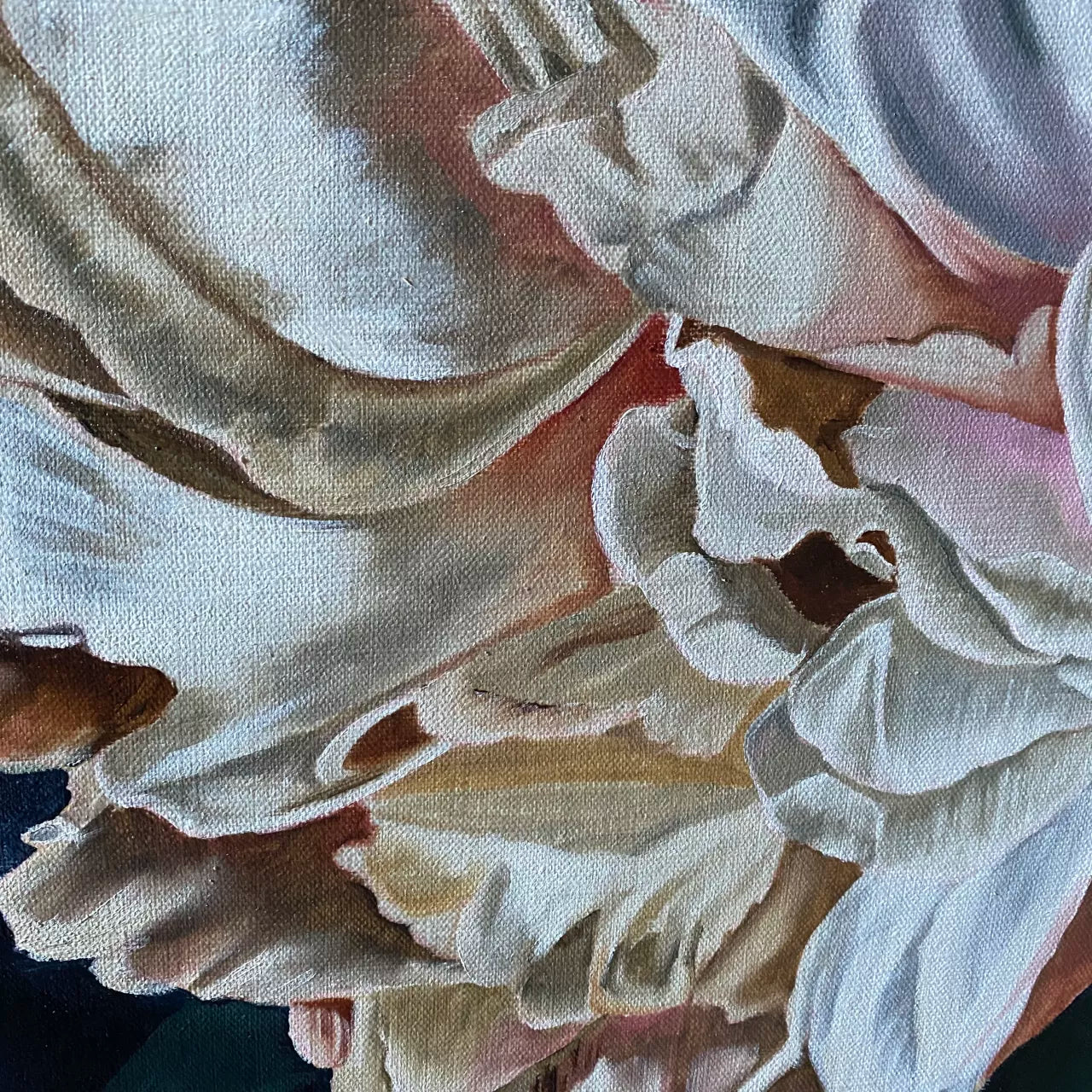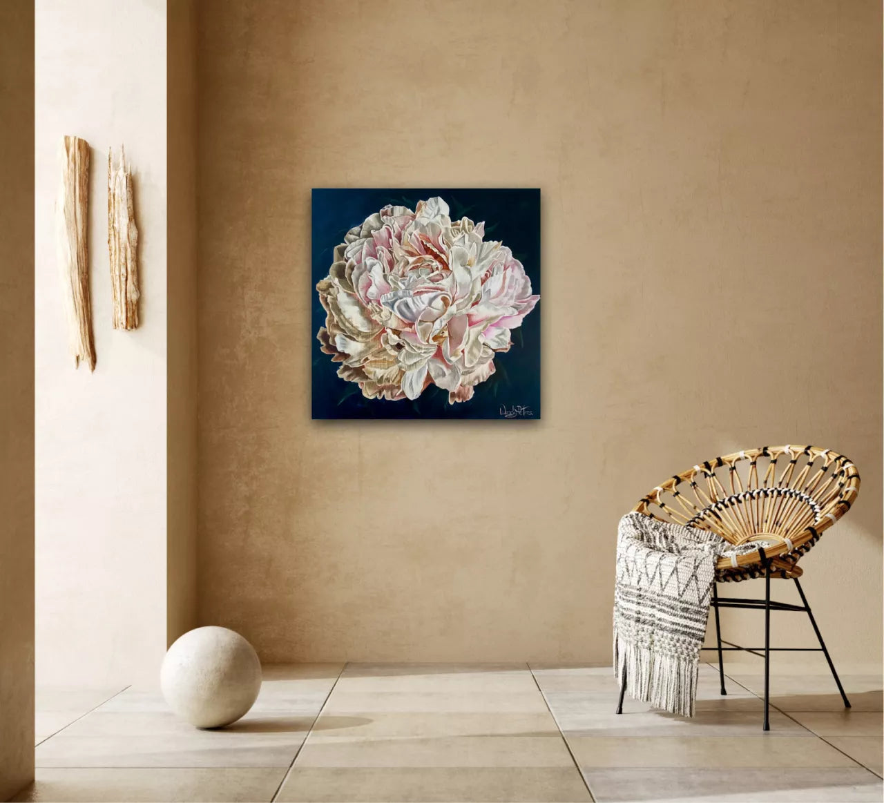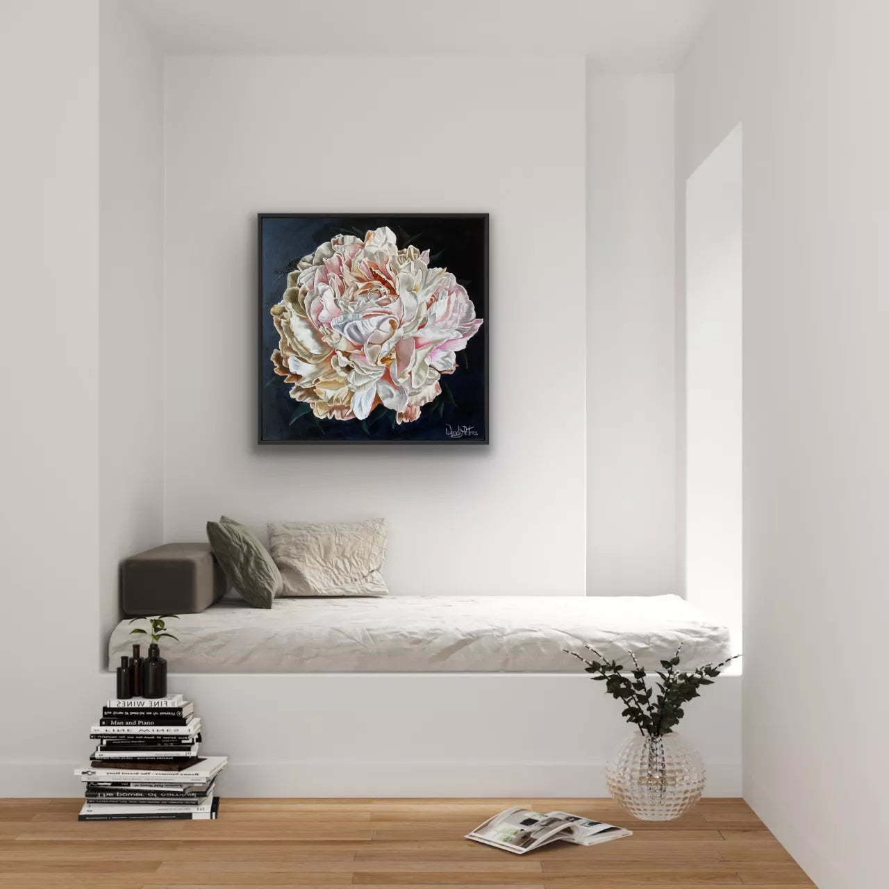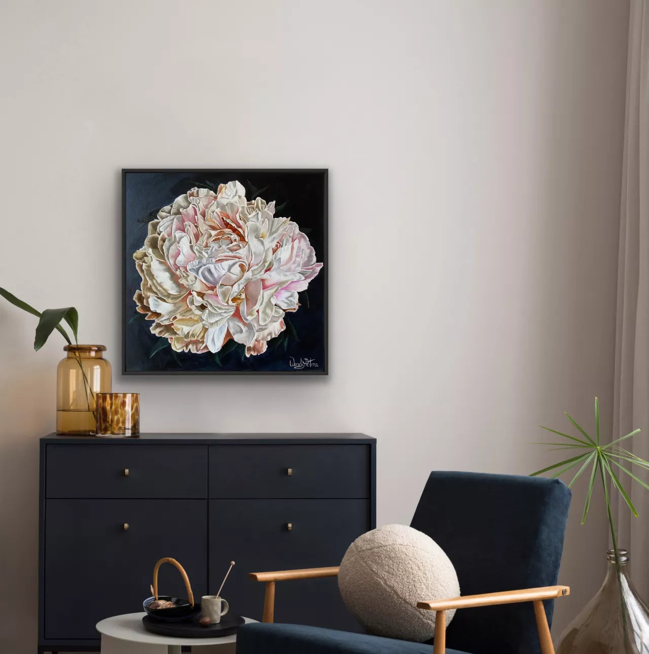 Working with light and shadow, unveiling a solitary pale pink peony. The subtle gradations of tones and the juxtaposition of brightness and darkness create a captivating atmosphere that invites contemplation and whispers of delicate beauty. Revealing the flower’s vulnerability and strength, as it emanates a soft radiance that illuminates the heart and captivates the soul. I aim to capture the ephemeral beauty of this fleeting moment, frozen in time for eternity. Framed in a black oak float frame.